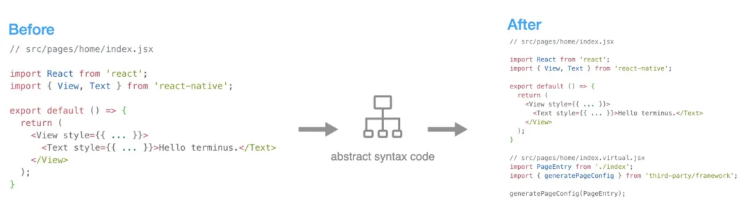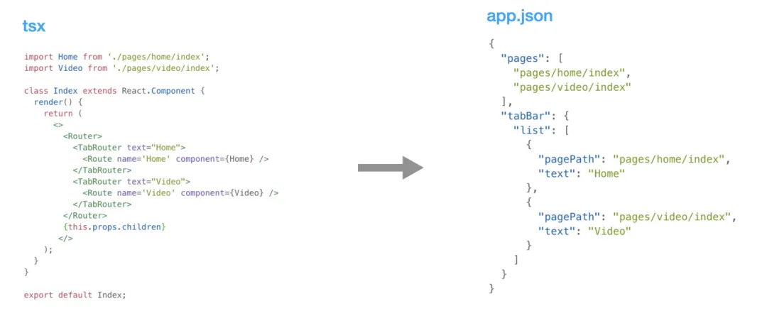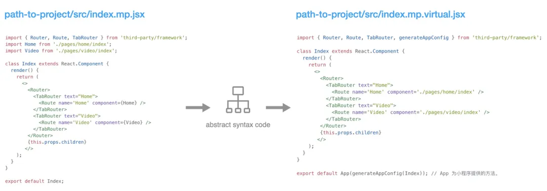 解析路由的核心逻辑是对源码进行 AST(抽象语法树) 操作。我们再回过头来看一下路由的声明方式:import { Router, Route, TabRouter } from 'third-party/framework';import Home from './pages/home/index';import Video from './pages/video/index';class Index extends React.Component { render() { return ( <> <Router> <TabRouter text="Home"> <Route name='Home' component={Home} /> </TabRouter> <TabRouter text="Video"> <Route name='Video' component={Video} /> </TabRouter> </Router> {this.props.children} </> ); }}export default Index;