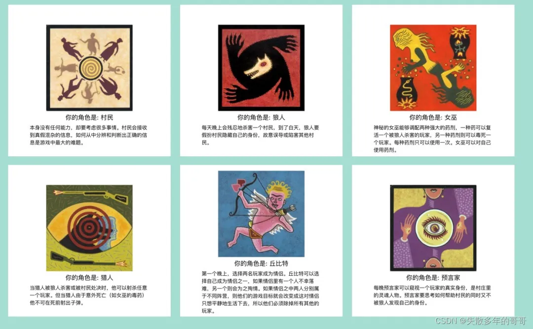 主要角色有:狼人 、预言家 、平民 、女巫 、猎人 、白痴 、守卫 、骑士等
