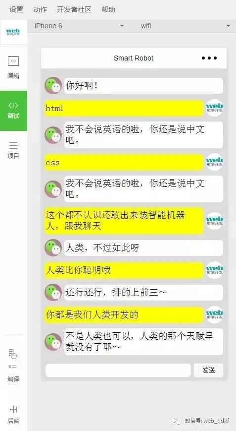 用小程序实现的机器人聊天,你可以随便调侃哦,非常好玩,随便虐他,当你无聊的时候,就可以虐一下他,这个就是我们程序员的独具特色的地方。