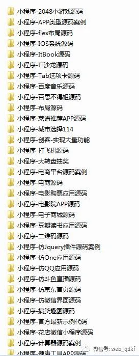 在前面我跟大家分享过一篇《【小程序源码案例】微信小程序项目开发案例分享》的文章,里面把开发工具,实例教程,均分享给了大家,今天再跟大家分享一期专题资源,这期小程序资源,均收集整理了70多款小程序源码,里面包含了很多常用的小程序开发效果,资源如下图:
