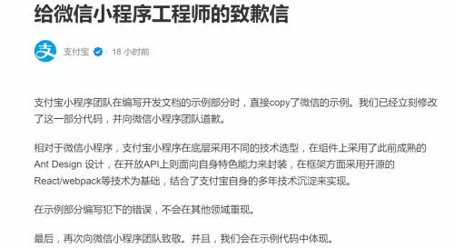 【TechWeb报道】8月19日消息,18日下午支付宝小程序团队在知乎上发布了《给微信小程序工程师的致歉信》,在该信中,支付宝对于自己的直接copy了微信的示例行为表示道歉,表示已经立即修改。