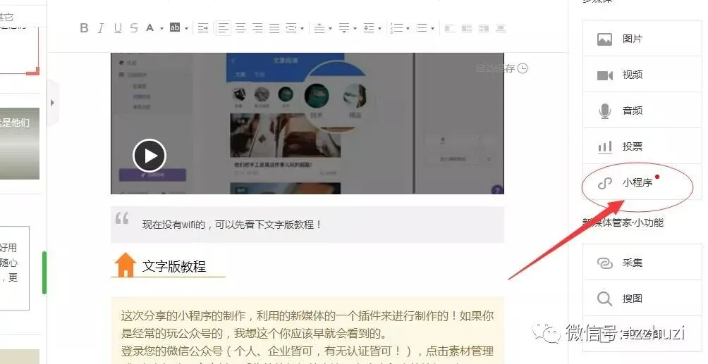 登录您的微信公众号(个人、企业皆可,有无认证皆可!),点击素材管理=》点击新建图文素材,看你的编辑框的右边,有个小程序的按钮,如下图: