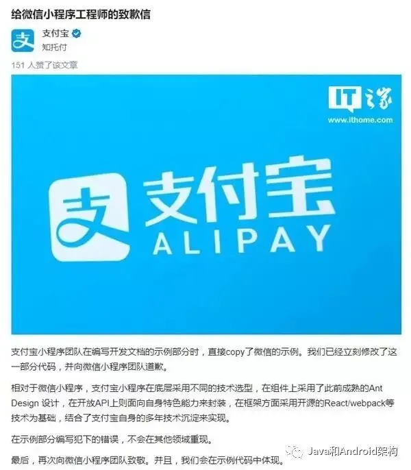 针对此事,支付宝小程序团队今天下午在知乎上发布了《给微信小程序工程师的致歉信》。信中表示,支付宝小程序团队在编写开发文档的示例部分时,直接copy了微信的示例。目前这部分代码已经修改,支付宝小程序团队也向微信小程序团队进行了道歉。