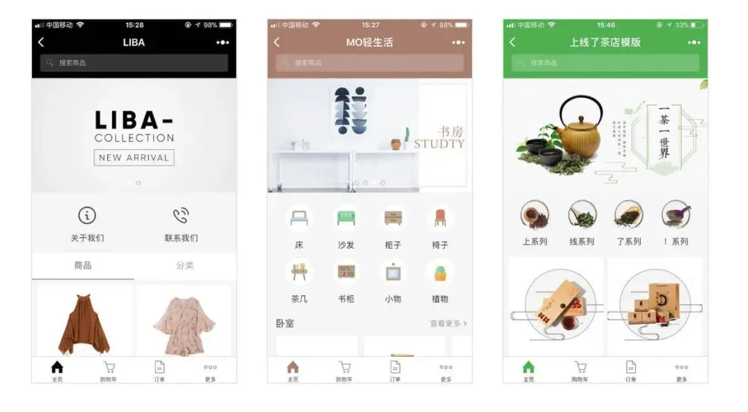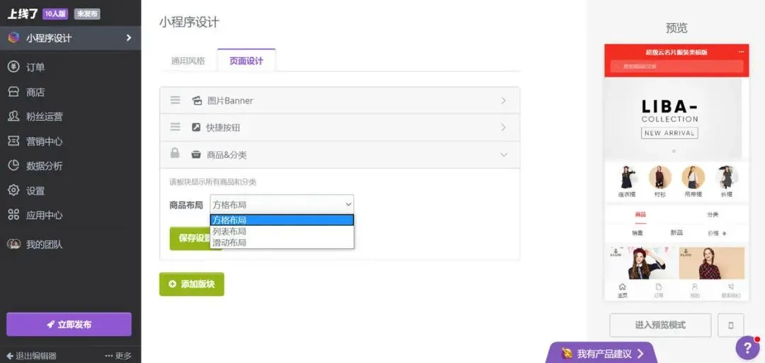 以电商模板为例,你可以在编辑器里设置主题色、导航栏,添加各种功能版块(轮播图、拼接图、快捷按钮、视频、标题、商品列表等等)。