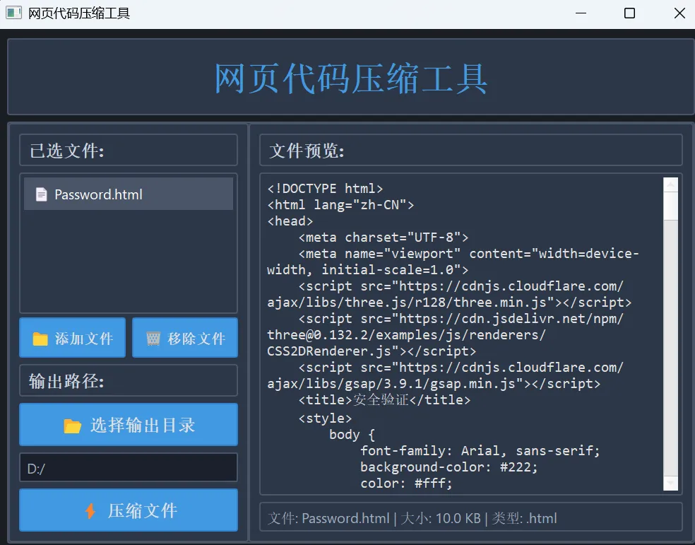 import sysimport osimport reimport jsonfrom PyQt5.QtWidgets import (QApplication, QMainWindow, QWidget, QVBoxLayout,QHBoxLayout, QPushButton, QLabel, QTextEdit,QFileDialog, QMessageBox, QFrame, QListWidget,QListWidgetItem, QProgressBar, QSplitter)from PyQt5.QtCore import Qtfrom PyQt5.QtGui import QFontclassWebCodeCompressorApp(QMainWindow):def__init__(self):super().__init__()self.files = []self.output_directory = Noneself.initUI()definitUI(self):"""初始化用户界面"""self.setWindowTitle('网页代码压缩工具')self.setGeometry(100, 100, 1000, 700)self.setup_style()self.create_widgets()self.setup_connections()defsetup_style(self):"""设置界面样式"""self.setStyleSheet("""QMainWindow {background-color: #1a1d23;}QWidget {color: #e0e0e0;font-family: 'Segoe UI', Arial, sans-serif;}QPushButton {background-color: #2d3748;border: 2px solid #4a5568;color: #e0e0e0;padding: 10px 20px;border-radius: 4px;font-weight: bold;font-size: 12px;}QPushButton:hover {background-color: #4a5568;border-color: #718096;}QPushButton:pressed {background-color: #1a202c;border-color: #2d3748;}QPushButton:disabled {background-color: #2d3748;color: #718096;}QListWidget {background-color: #2d3748;border: 2px solid #4a5568;border-radius: 4px;padding: 5px;font-size: 12px;}QListWidget::item {padding: 8px;border-bottom: 1px solid #4a5568;}QListWidget::item:selected {background-color: #4a5568;color: #ffffff;}QTextEdit {background-color: #2d3748;border: 2px solid #4a5568;border-radius: 4px;padding: 12px;font-family: 'Consolas', 'Monaco', monospace;font-size: 12px;}QLabel {padding: 5px;color: #cbd5e0;}QProgressBar {border: 2px solid #4a5568;border-radius: 4px;text-align: center;background-color: #2d3748;color: #e0e0e0;height: 20px;}QProgressBar::chunk {background-color: #4299e1;border-radius: 2px;}QFrame {background-color: #2d3748;border-radius: 4px;border: 2px solid #4a5568;}QSplitter::handle {background-color: #4a5568;width: 4px;}""")defcreate_widgets(self):"""创建界面控件"""central_widget = QWidget()self.setCentralWidget(central_widget)layout = QVBoxLayout(central_widget)# 标题title = QLabel("网页代码压缩工具")title.setAlignment(Qt.AlignCenter)title_font = QFont('Segoe UI', 24, QFont.Bold)title.setFont(title_font)title.setStyleSheet("color: #4299e1; padding: 20px; border-bottom: 2px solid #4a5568;")layout.addWidget(title)# 创建分割器splitter = QSplitter(Qt.Horizontal)# 左侧面板left_frame = QFrame()left_frame.setMaximumWidth(350)left_layout = QVBoxLayout(left_frame)# 文件列表区域file_label = QLabel("已选文件:")file_label.setFont(QFont('Segoe UI', 12, QFont.Bold))left_layout.addWidget(file_label)self.file_list = QListWidget()self.file_list.setMinimumHeight(200)self.file_list.setStyleSheet("font-size: 20px; padding: 5px;")left_layout.addWidget(self.file_list)# 按钮区域button_layout = QHBoxLayout()self.add_button = QPushButton("📁 添加文件")self.add_button.clicked.connect(self.add_files)self.add_button.setStyleSheet("""QPushButton {background-color: #4299e1;border-color: #3182ce;font-size: 20px;padding: 12px;}QPushButton:hover {background-color: #3182ce;border-color: #2c5282;}""")button_layout.addWidget(self.add_button)self.remove_button = QPushButton("🗑️ 移除文件")self.remove_button.clicked.connect(self.remove_file)self.remove_button.setStyleSheet("""QPushButton {background-color: #4299e1;border-color: #3182ce;font-size: 20px;padding: 12px;}QPushButton:hover {background-color: #3182ce;border-color: #2c5282;}""")button_layout.addWidget(self.remove_button)left_layout.addLayout(button_layout)# 输出路径选择output_layout = QVBoxLayout()output_label = QLabel("输出路径:")output_label.setFont(QFont('Segoe UI', 12, QFont.Bold))output_layout.addWidget(output_label)self.output_path_button = QPushButton("📂 选择输出目录")self.output_path_button.clicked.connect(self.select_output_directory)self.output_path_button.setStyleSheet("""QPushButton {background-color: #4299e1;border-color: #3182ce;font-size: 24px;padding: 12px;}QPushButton:hover {background-color: #3182ce;border-color: #2c5282;}""")output_layout.addWidget(self.output_path_button)self.output_path_label = QLabel("未选择目录")self.output_path_label.setStyleSheet("""color: #a0aec0;font-size: 20px;padding: 5px;background-color: #1a202c;border-radius: 3px;""")self.output_path_label.setWordWrap(True)output_layout.addWidget(self.output_path_label)left_layout.addLayout(output_layout)# 压缩按钮self.process_button = QPushButton("⚡ 压缩文件")self.process_button.clicked.connect(self.process_files)self.process_button.setStyleSheet("""QPushButton {background-color: #4299e1;border-color: #3182ce;font-size: 24px;padding: 12px;}QPushButton:hover {background-color: #3182ce;border-color: #2c5282;}""")left_layout.addWidget(self.process_button)# 进度条self.progress_bar = QProgressBar()self.progress_bar.setVisible(False)left_layout.addWidget(self.progress_bar)left_layout.addStretch()# 右侧面板 - 预览right_frame = QFrame()right_layout = QVBoxLayout(right_frame)preview_label = QLabel("文件预览:")preview_label.setFont(QFont('Segoe UI', 12, QFont.Bold))right_layout.addWidget(preview_label)self.preview_edit = QTextEdit()self.preview_edit.setPlaceholderText("选择文件以预览...")self.preview_edit.setStyleSheet("font-size: 20px; padding: 5px;")self.preview_edit.setMinimumHeight(400)right_layout.addWidget(self.preview_edit)# 状态标签self.preview_status = QLabel("")self.preview_status.setStyleSheet("color: #a0aec0; font-size: 20px; padding: 5px;")right_layout.addWidget(self.preview_status)# 添加到分割器splitter.addWidget(left_frame)splitter.addWidget(right_frame)splitter.setSizes([350, 650])layout.addWidget(splitter)# 状态栏self.statusBar().setStyleSheet("background-color: #1a202c; color: #a0aec0;")self.statusBar().showMessage("就绪")defsetup_connections(self):"""设置信号连接"""self.file_list.currentItemChanged.connect(self.preview_file)defadd_files(self):"""添加文件到列