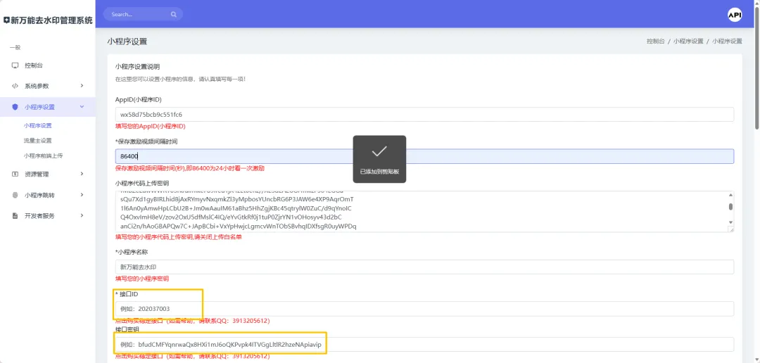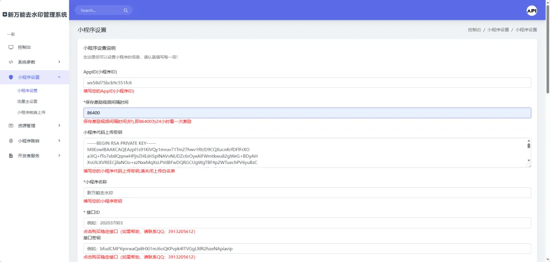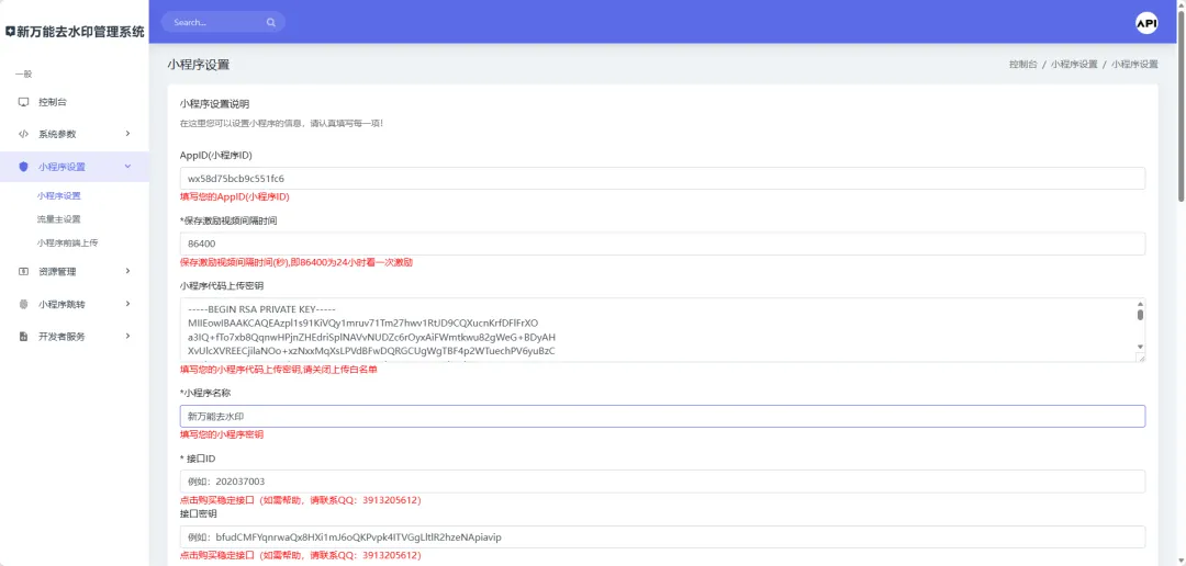 后台登录地址:你域名/admin后台登录账号:admin后台密码:123456后台安全码:安装时候填的先将信息设置一遍,appid一定要对,不需要密钥。需要的是小程序上传密钥,不知道填哪个看后面教程。