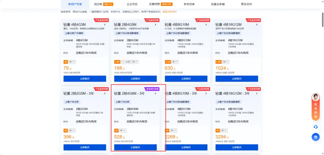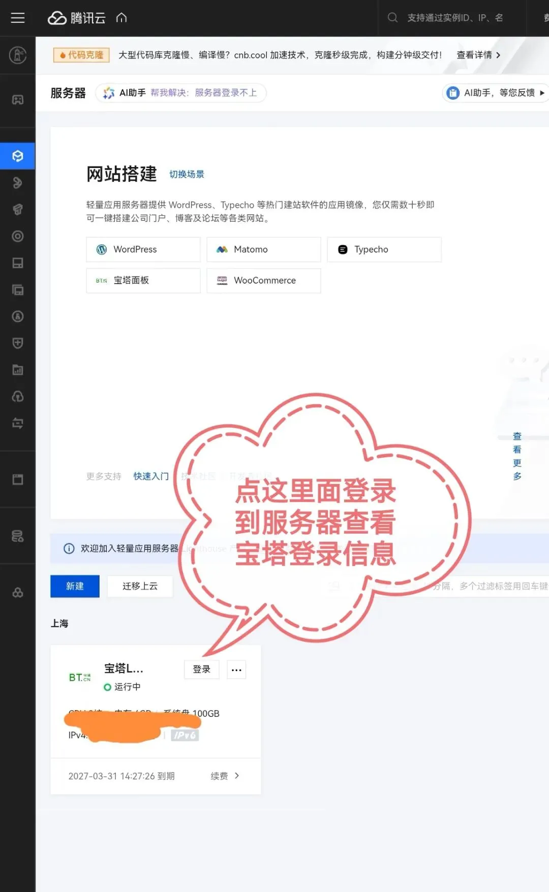服务器:越大越好备案域名:必须备案1.首先话是购买服务器,目前服务器新人的话,价格比较便宜,我这边以腾讯云为例。我选择他的原因是备案直接在手机就可以完成,省了很多事,配置低的首年价格也不高,相对于初学者还是很不错的。【阿里云或腾讯云】云产品限时秒杀,爆款4核4G云服务器,可以选择首年79元,如果预算够就买个3年528块的轻量云服务器,