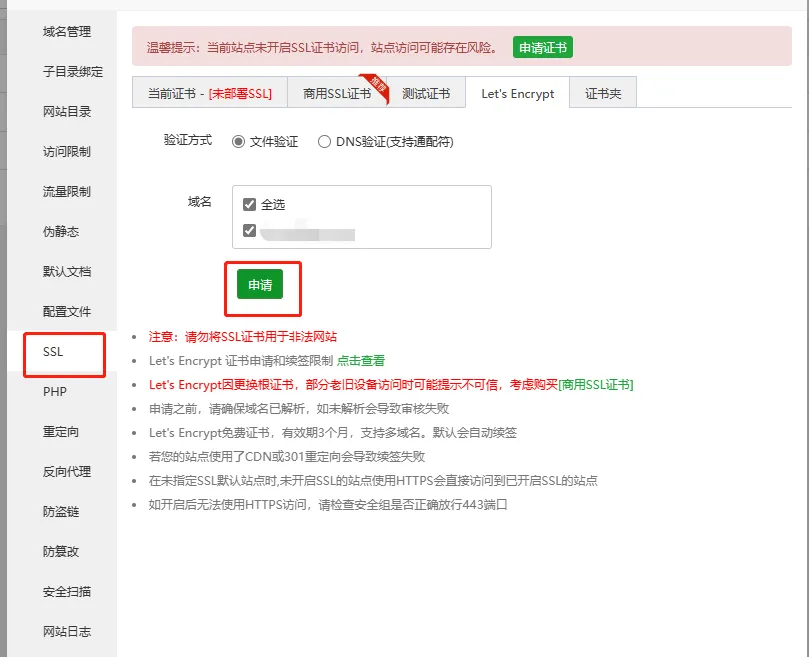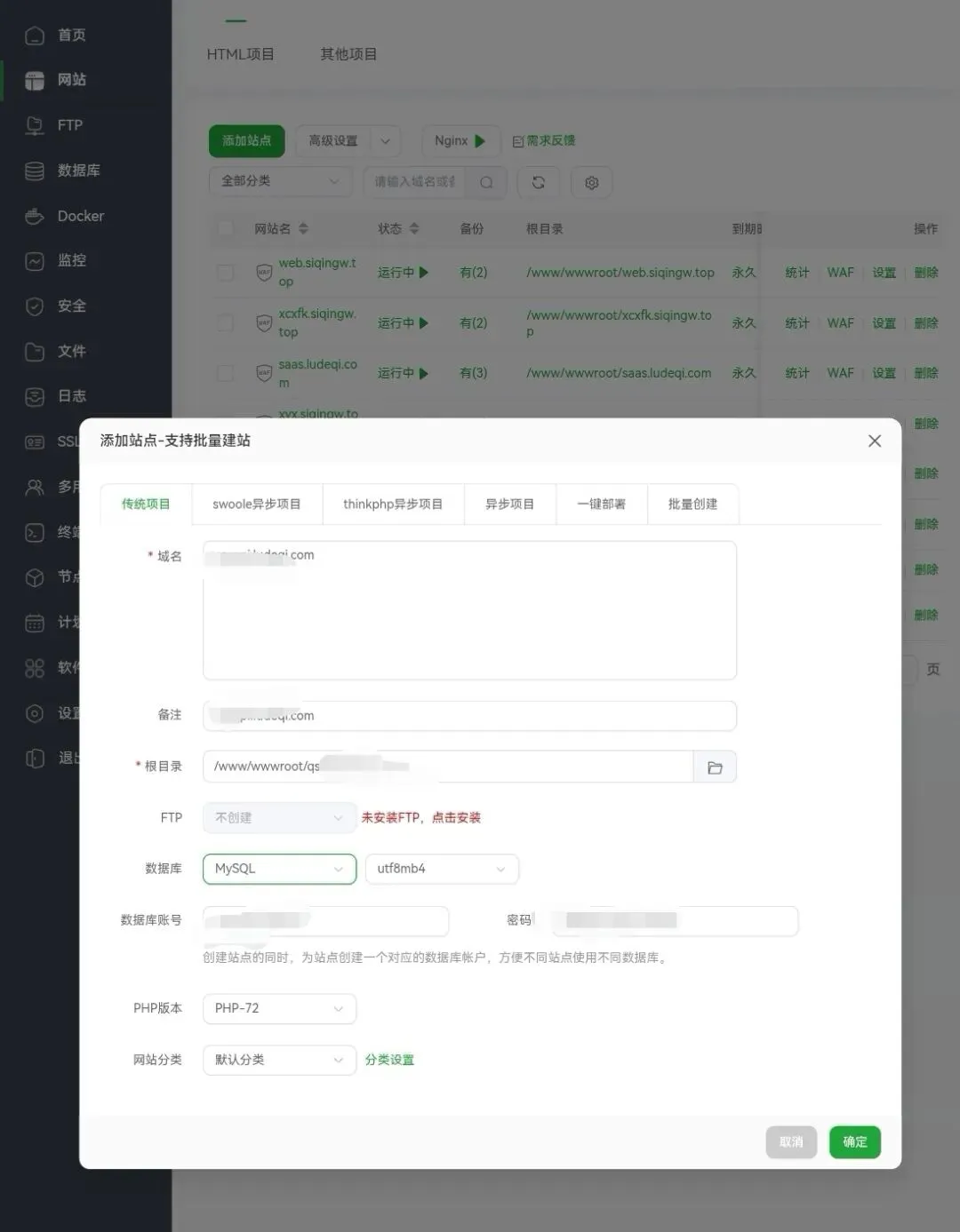 安装准备环境:php7.2以上+mysql域名:必须备案,申请SSL证书1、在宝塔上PHP项目中添加站点,php选择7.2版本的,高于7.2的可能有问题。
