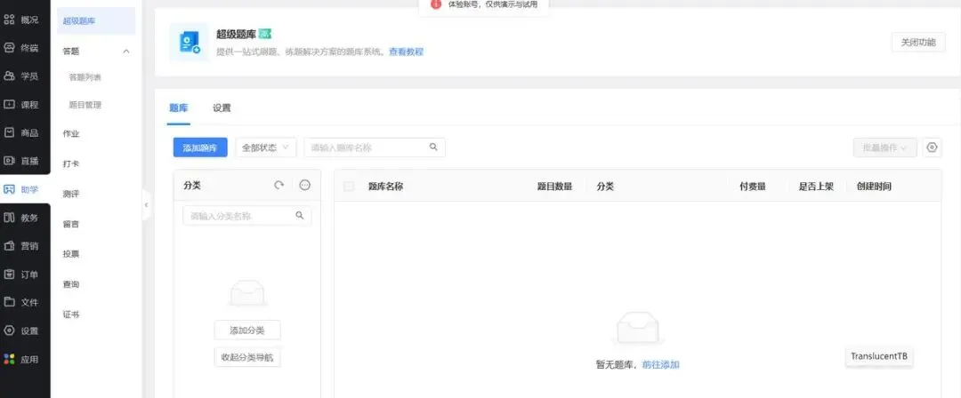 填信息:题库名称、摘要安排上,分类能设三级(比如 “考公→行测→言语理解”),用户找题不迷路