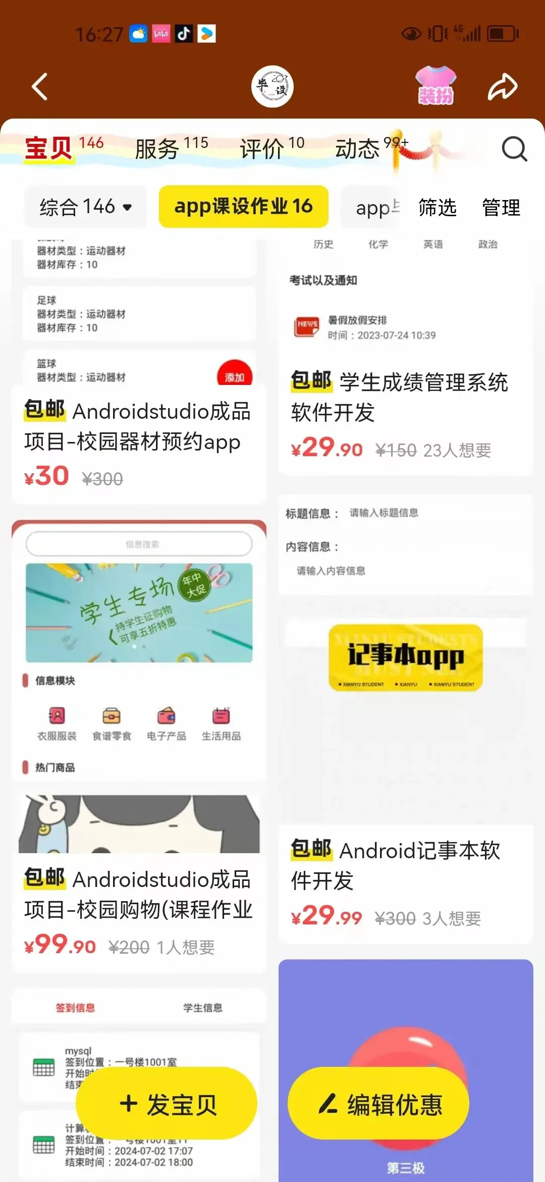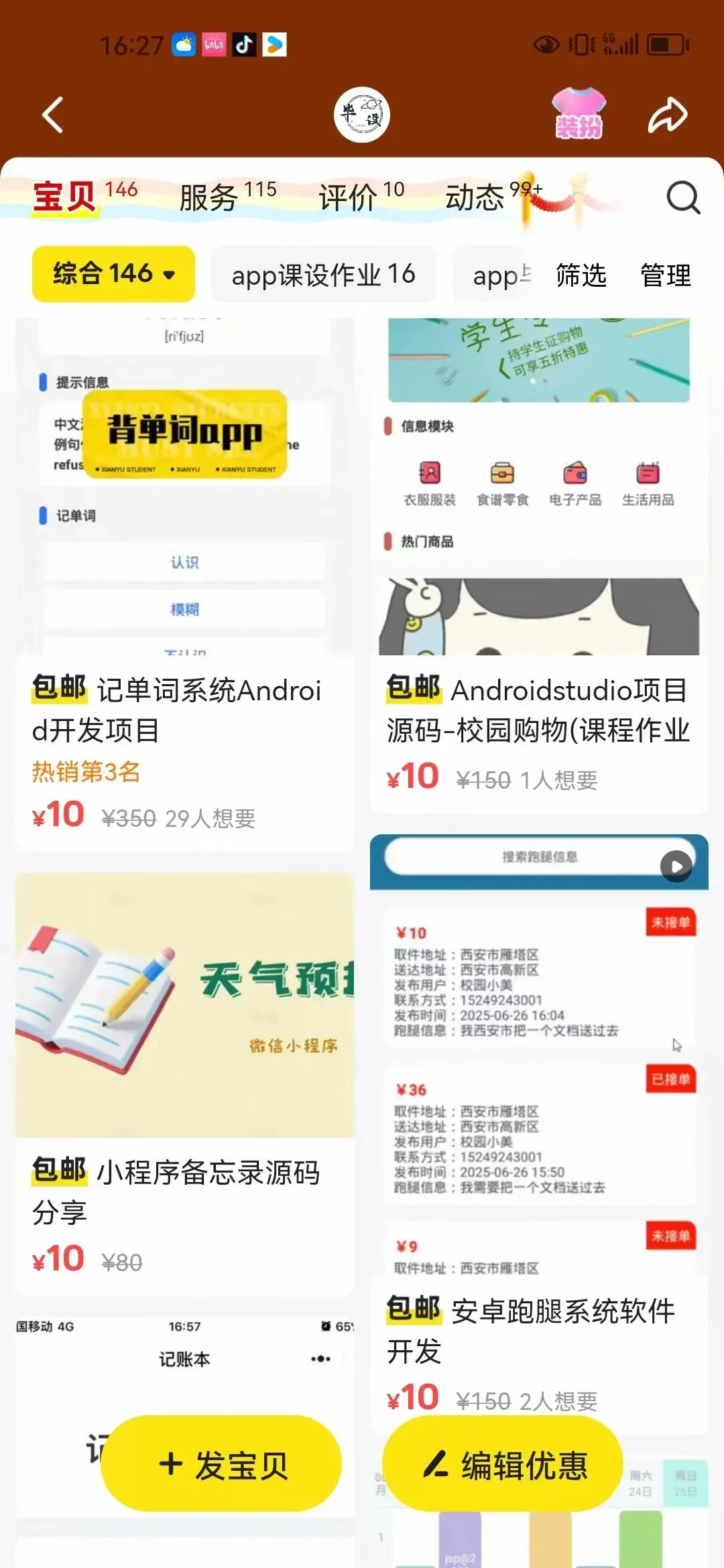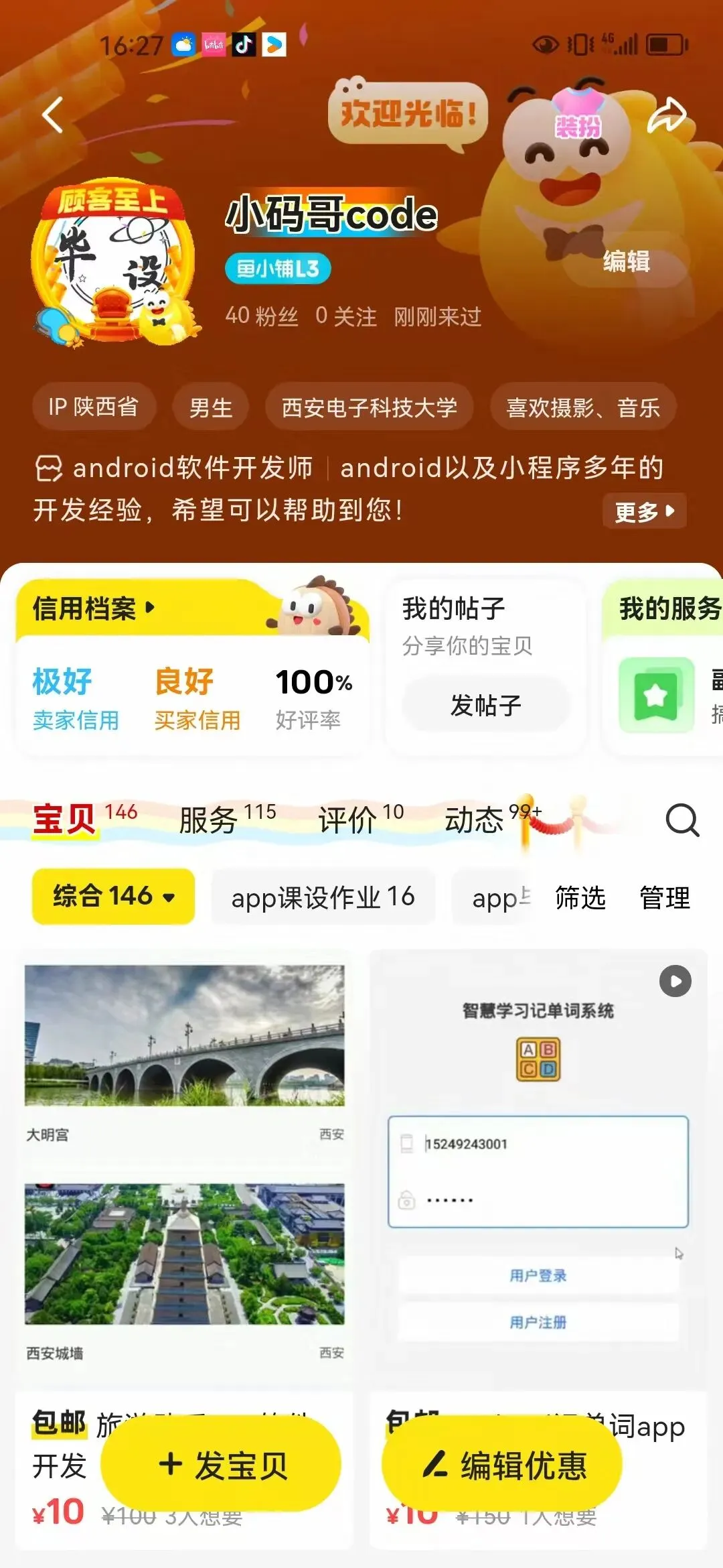 大家假如有源码的需要可以关注一下本人的闲鱼账号信息,首页如下,费用也很低,里面有Android的课设app,微信小程序课设,网页管理系统,以及带后台的app、微信小程序; 源码本身都是我自己写的,假如遇到运行不清楚的问题可以咨询我,大家有兴趣的可以去看一下;