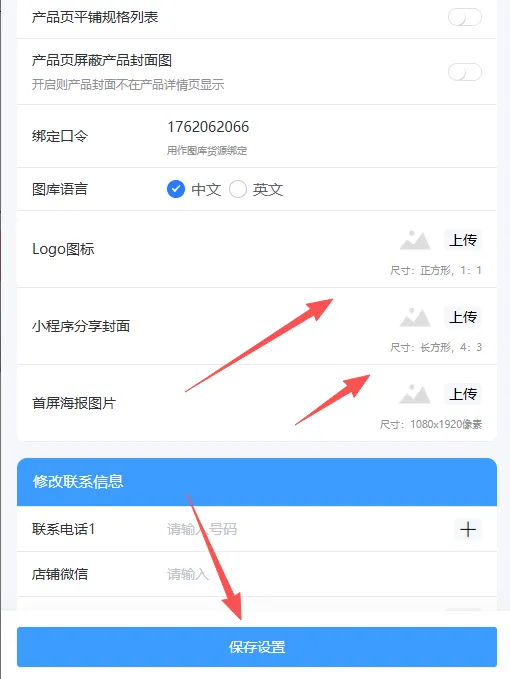 上传小程序图标与分享封面,完成上传后点击保存,即可快速完成小程序的展示设置。