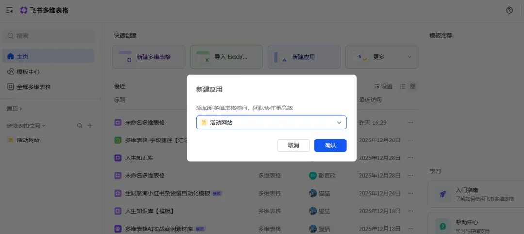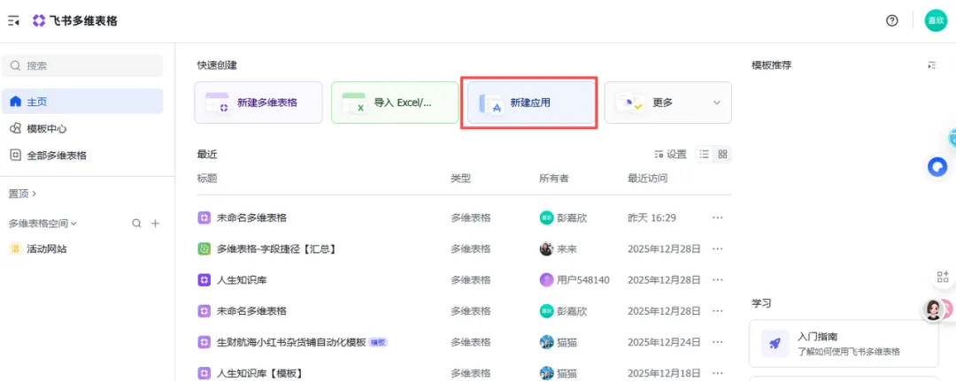 首先,我们打开飞书多维表格,点击“新建应用”。你可以把它理解成获得了一块空地,准备开始建造啦!