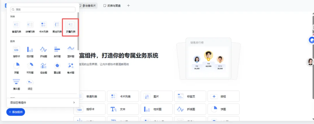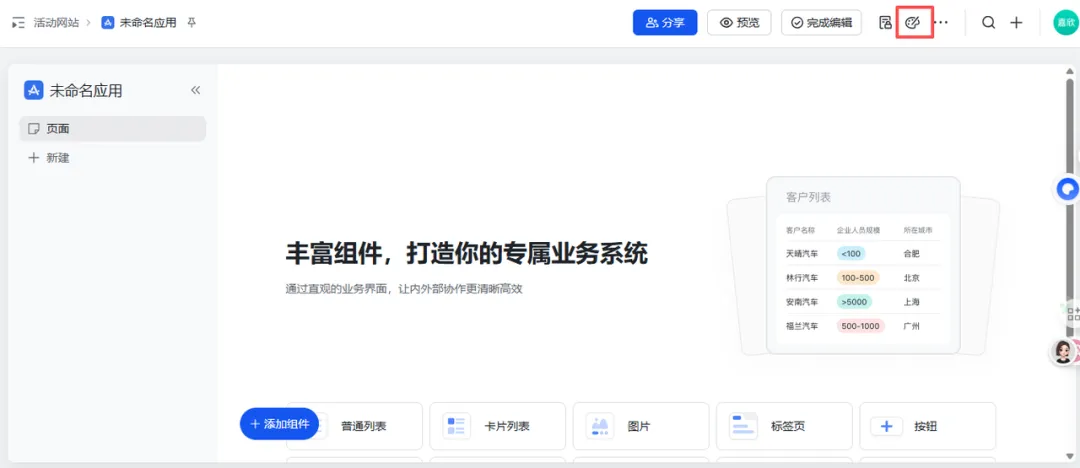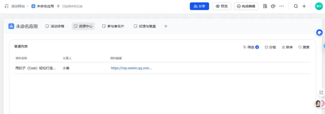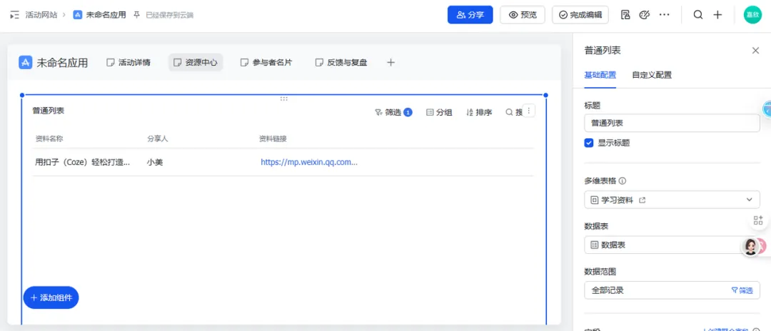 :在页面上添加一个“普通列表”组件,关联刚才建的“学习资料”表。