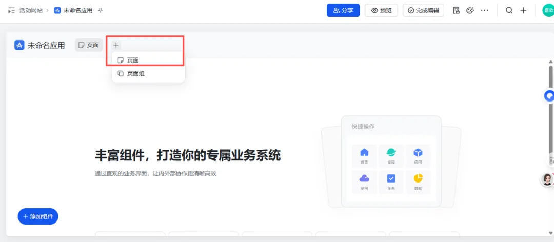:点击“添加页面”,为我们规划好的四个模块分别创建一个页面,它们就会出现在导航栏上了。