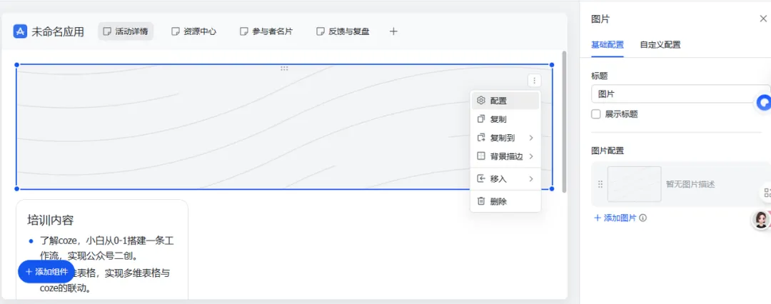 :点击“配置”可以上传一张漂亮的活动主视觉Banner图。你甚至可以上传多张,它会自动轮播,像个小海报墙!🎨