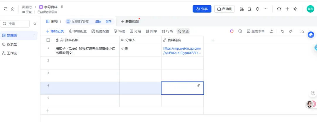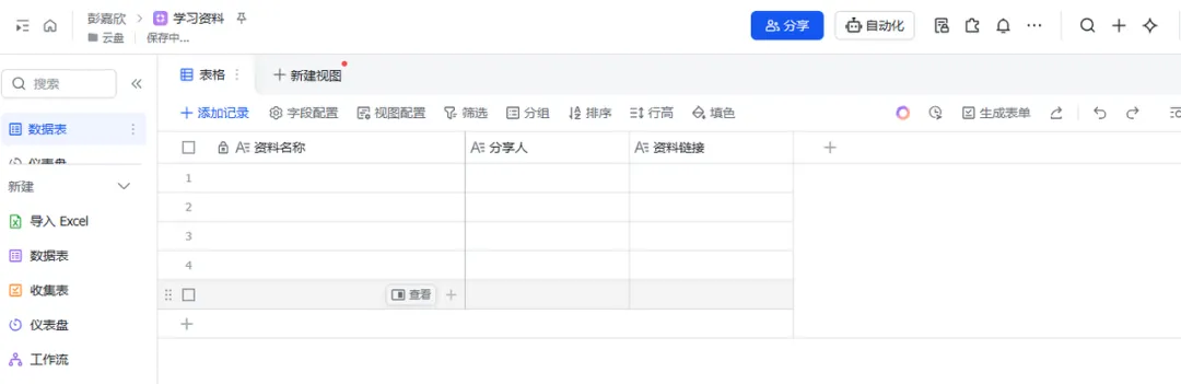 :在后台新建一个叫“学习资料”的多维表格。只需要三列: