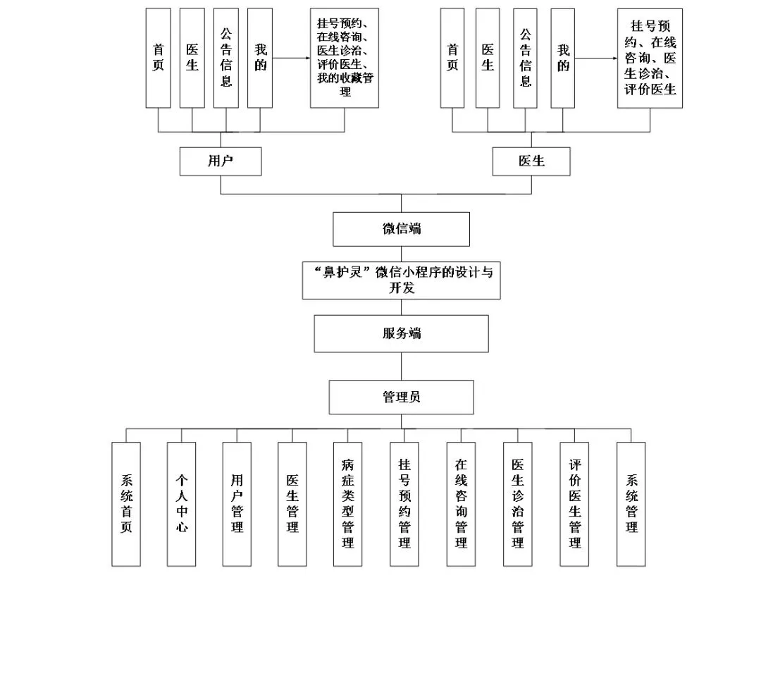 - 管理端: 系统首页、个人中心、用户与医生管理、病症分类维护、挂号与诊治管理、评价管理及系统设置。