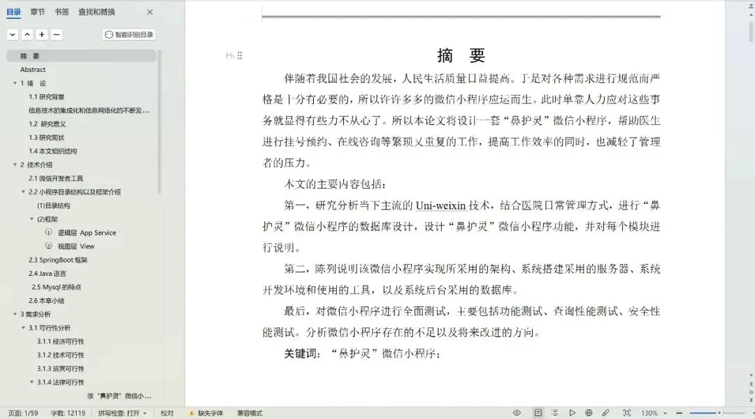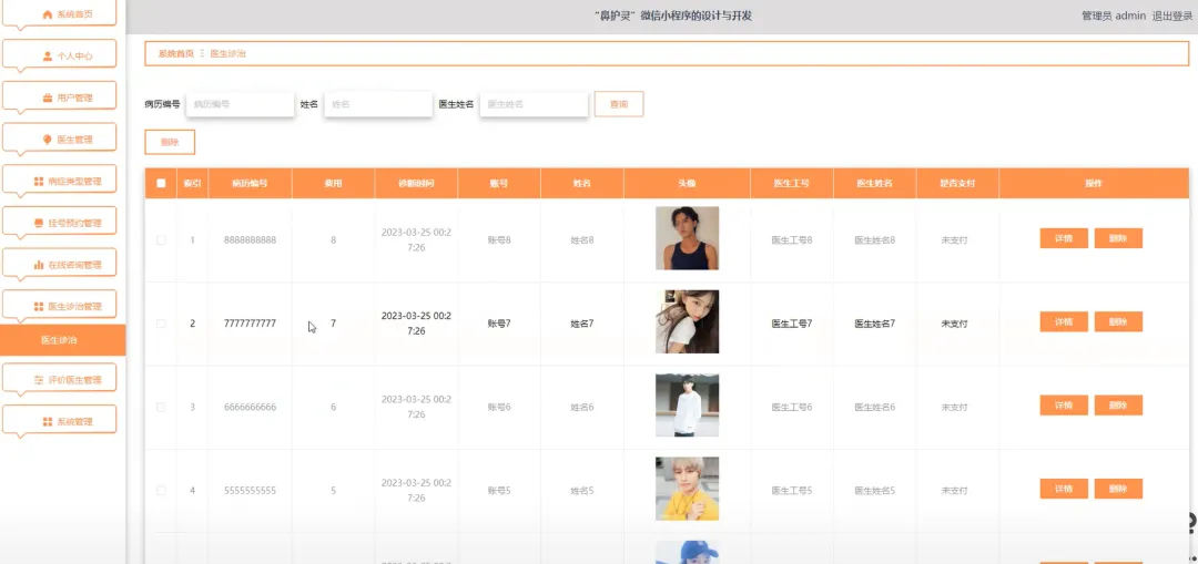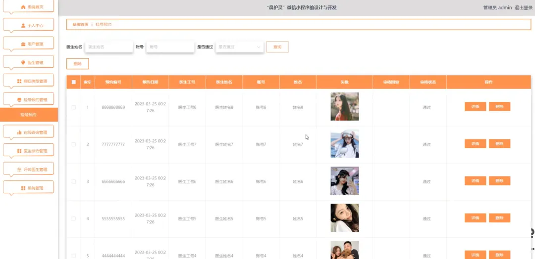 本项目是一款名为“鼻护灵”的微信小程序,主要解决医院挂号难和咨询不便的问题。它打通了患者与医生的连接,患者可以在线预约门诊、咨询病情;医生能高效处理诊治请求;管理员则通过后台统筹全局,管理用户、医生及各类预约信息。
