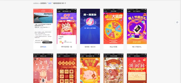 登录之后我们就可以选择模版了,这里有很多模板可以选择,根据需要选一个就可以开始装修啦。如果想快速定位自己需要的模版,只需要在搜索栏搜相关的关键词就可以啦,比如说今天要做抽奖,那么输入“抽奖”,就能快速定位到相关模版了。