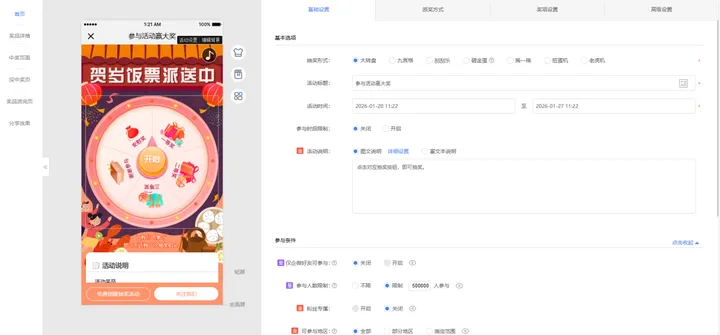 来到装修页面后,咱先设置好基础信息,比如说抽奖形式,活动标题,还有活动时间等等,这里只需要我们动动鼠标,敲敲键盘就能做好,非常方便,不用碰代码。