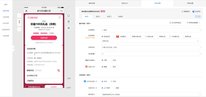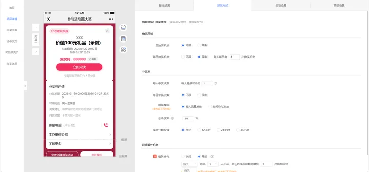 设置好派奖方式,咱来到【派奖方式】这里,可以对抽奖限制、中奖率、获得额外机会等内容进行设置,比如说想设置中奖率是20%,那么在【中奖率】中的【总中奖率】这一栏修改就可以啦。