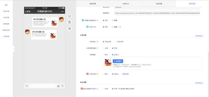 敲重点!咱们要设置好抽奖内容,在【奖品详情--奖项设置】这里设置好你的奖项内容,一等奖是啥、二等奖是啥,把这些信息填好,设置好数量。另外还能在安全设置里开启防刷,自动识别异常账号,保障活动公平性。