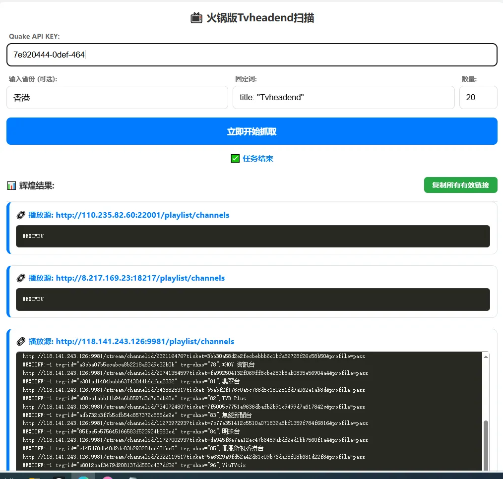 <?php/** * Tvheadend 扫描器 V9.5 - 手动输入省份版 * 修复:1. 下拉菜单改为手动输入;2. 自动解决中文乱码;3. 直接输出 M3U 源码 */set_time_limit(0);ini_set('memory_limit', '512M');if (isset($_GET['action']) && $_GET['action'] == 'scan') { header('Content-Type: text/event-stream'); header('Cache-Control: no-cache'); header('X-Accel-Buffering: no'); $data = json_decode(file_get_contents('php://input'), true); $apiKey = $data['key'] ?? ''; $query = $data['query'] ?? ''; $size = (int)($data['size'] ?? 10); // 1. 请求 Quake 接口 $ch = curl_init("https://quake.360.net/api/v3/search/quake_service"); curl_setopt($ch, CURLOPT_RETURNTRANSFER, true); curl_setopt($ch, CURLOPT_HTTPHEADER, ["X-QuakeToken: $apiKey", "Content-Type: application/json"]); curl_setopt($ch, CURLOPT_POSTFIELDS, json_encode(["query" => $query, "start" => 0, "size" => $size])); $response = curl_exec($ch); $result = json_decode($response, true); curl_close($ch); $items = $result['data'] ?? []; $targets = []; foreach ($items as $item) { if (isset($item['ip']) && isset($item['port'])) { $targets[] = $item['ip'] . ":" . $item['port']; } } $targets = array_unique($targets); // 2. 并发探测 $mh = curl_multi_init(); $ch_list = []; foreach ($targets as $addr) { $url = "http://$addr/playlist/channels"; $ch = curl_init($url); curl_setopt($ch, CURLOPT_RETURNTRANSFER, true); curl_setopt($ch, CURLOPT_TIMEOUT, 12); curl_setopt($ch, CURLOPT_CONNECTTIMEOUT, 5); curl_setopt($ch, CURLOPT_FOLLOWLOCATION, true); curl_multi_add_handle($mh, $ch); $ch_list[$addr] = $ch; } $active = null; do { $mrc = curl_multi_exec($mh, $active); while ($done = curl_multi_info_read($mh)) { $ch = $done['handle']; $addr = array_search($ch, $ch_list); $content = curl_multi_getcontent($ch); $info = curl_getinfo($ch); if ($info['http_code'] == 200 && stripos($content, '#EXTM3U') !== false) { // 处理编码防止乱码 $encode = mb_detect_encoding($content, array("ASCII", "UTF-8", "GB2312", "GBK", "BIG5")); if ($encode !== "UTF-8") { $content = mb_convert_encoding($content, "UTF-8", $encode); } echo "####URL:http://$addr/playlist/channels\n"; echo "####M3U_DATA:" . base64_encode($content) . "\n"; } ob_flush(); flush(); curl_multi_remove_handle($mh, $ch); curl_close($ch); } } while ($active && $mrc == CURLM_OK); curl_multi_close($mh); exit;}?><!DOCTYPE html><html><head> <metacharset="UTF-8"> <metaname="viewport"content="width=device-width, initial-scale=1.0"> <title>Tvheadend 源码扫描 V9.5</title> <style> body { font-family: -apple-system, sans-serif; background: #f4f7f9; padding: 10px; margin: 0; } .card { background: #fff; border-radius: 12px; padding: 15px; box-shadow: 0 4px 12px rgba(0,0,0,0.1); max-width: 900px; margin: auto; } input, button { width: 100%; padding: 12px; margin: 5px 0; border: 1px solid #ddd; border-radius: 8px; box-sizing: border-box; font-size: 15px; } .btn-primary { background: #007bff; color: white; border: none; font-weight: bold; cursor: pointer; height: 50px; margin-top: 10px; } .btn-copy { background: #28a745; color: white; border: none; font-weight: bold; width: auto; padding: 6px 15px; border-radius: 6px; font-size: 13px; cursor: pointer; display: none; } .results-header { display: none; justify-content: space-between; align-items: center; margin-top: 20px; padding-bottom: 10px; border-bottom: 2px solid #eee; } .res-card { background: #fff; border: 1px solid #e0e6ed; border-left: 6px solid #007bff; border-radius: 10px; margin-bottom: 20px; padding: 12px; } .res-link { display: block; color: #007bff; text-decoration: none; font-size: 14px; font-weight: bold; word-break: break-all; margin-bottom: 10px; } .m3u-content { background: #272822; color: #f8f8f2; padding: 12px; border-radius: 6px; font-family: monospace; font-size: 11px; white-space: pre; overflow: auto; max-height: 250px; line-height: 1.4; border: 1px solid #3e3e3e; } .label-text { font-size: 12px; color: #666; margin-left: 5px; margin-top: 10px; display: block; font-weight: bold; } #status { text-align: center; color: #007bff; font-weight: bold; margin: 10px 0; font-size: 14px; } </style></head><body> <divclass="card"> <h3style="text-align:center; margin:0 0 15px 0; color:#333;">📺 火锅版Tvheadend扫描</h3> <labelclass="label-text">Quake API KEY:</label> <inputtype="text"id="key"placeholder="在此输入 API KEY"> <divstyle="display:flex; gap:8px;"> <divstyle="flex:1;"> <labelclass="label-text">输入省份 (可选):</label> <inputtype="text"id="province_input"placeholder="如: 广东 / Hong Kong"> </div> <divstyle="flex:1;"> <labelclass="label-text">固定词:</label> <inputtype="text"id="query_keyword"value='title: "Tvheadend"'> </div> <divstyle="width: 70px;"> <labelclass="label-text">数量:</label> <inputtype="number"id="size"value="10"> </div> </div> <buttonid="btn"class="btn-primary"onclick="startScan()">立即开始抓取</button> <divid="status"></div> <divid="results-header"class="results-header"> <bstyle="font-size:15px; color: #333;">📊 辉煌结果:</b> <buttonid="copyBtn"class="btn-copy"onclick="copyAll()">复制所有有效链接</button> </div> <divid="results"></div> </div> <script> let allUrls = []; async function startScan() { const btn = document.getElementById('btn'); const status = document.getElementById('status'); const resultsDiv = document.getElementById('results'); const header = document.getElementById('results-header'); const copyBtn = document.getElementById('copyBtn'); const provValue = document.getElementById('province_input').value.trim(); const keyword = document.getElementById('query_keyword').value; // 构建查询语句 let finalQuery = provValue ? `province: "${provValue}" AND ${keyword}` : `country: "China" AND ${keyword}`; btn.disabled = true; allUrls = []; resultsDiv.innerHTML = ''; header.style.display = 'none'; status.innerText = '🚀 正在检索...'; try { const response = await fetch('?action=scan', { method: 'POST', headers: {'Content-Type': 'application/json'}, body: JSON.stringify({ ke