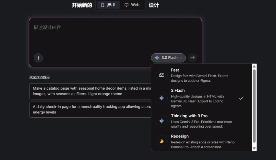 好的app离不开好的UI,这里我选用的工具是Google lab中的stich,在这里,你只需要描述好你的所有需求,它就能自动帮你生成相当美观的UI,还可以对每张图片进行仔细调整。在生成你所有想要的画面之后,框选全部图片生成原型,在stich中不断修改原型直至逻辑合理。然后导入至ai studio。