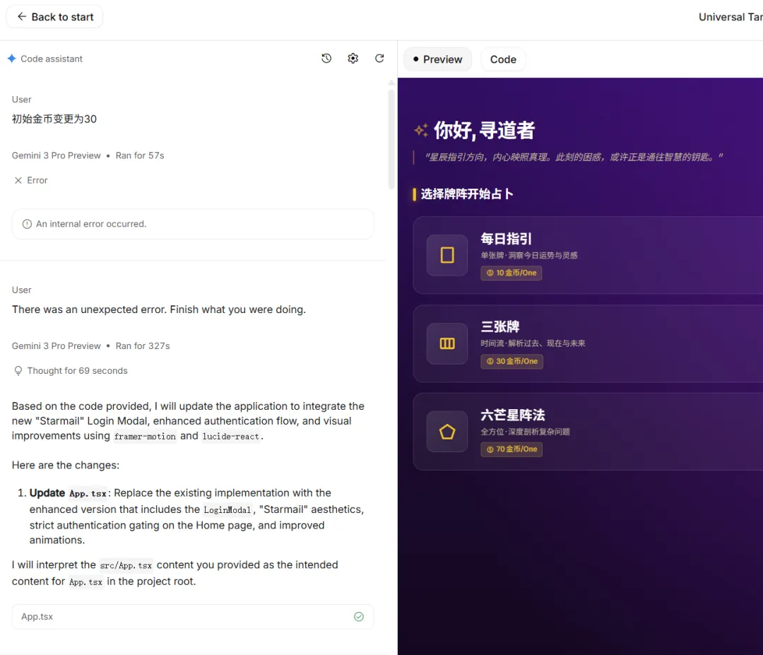这样导出有什么好处呢,好处就是它会把每个页面的html文件和图片文件一起放在ai studio的对话框里,这里我选用的是gemini 3 pro preview模型,在这里,详细地打好你所有的需求,这个模型是满血的gemini3,平均每轮对话思考时间均在150s以上,有时debug能整到1000多秒。