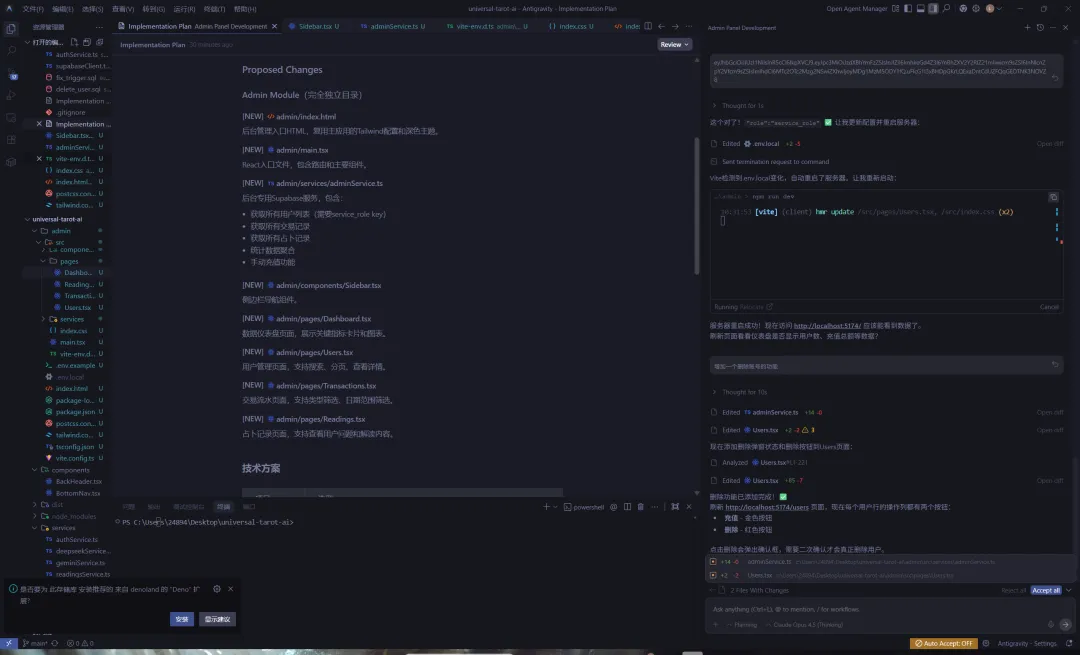 用antigravity打开文件夹,这里我是两个Google one pro会员账号轮流使用额度,我选取的模型为Claude opus 4.5(thinking),让它planning并搭建你的后端,它非常聪明,给他正确的prompt他会帮你完成你想完成所有事情。数据库服务我选用了supabase,邮箱验证码选用resend。