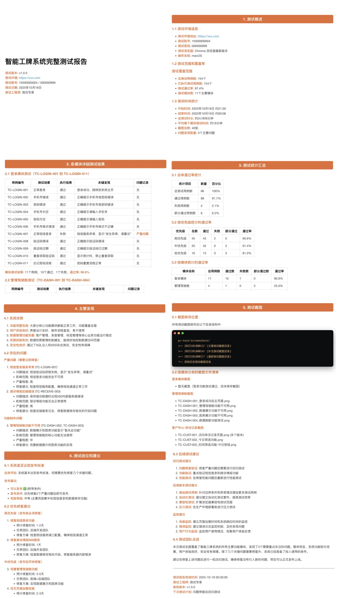 # XX智能工牌系统功能测试计划(模型管理完善版)使用 playwright MCP 进行对网站进行全面测试工具对网站进行测试# 测试执行计划## 1.3 测试环境- **测试环境地址**:https://xxxx.com/- **测试账号**:181****0347- **测试密码**:000000000- **测试工具**:Playwright MCP- **测试日期**:2025年10月17日## 2. 登录模块测试用例### 2.1 账号登录功能| 用例编号 | 测试场景 | 测试步骤 | 预期结果 | 优先级 || ------------ | -------------- | ----------------------------------------------------------------------- | ------------------------ | ------ || TC-LOGIN-001 | 正常登录 | 1.输入手机号:15000000004<br>2.输入密码:000000004<br>3.点击登录按钮 | 登录成功,跳转到系统主页 | 高 || TC-LOGIN-002 | 手机号错误 | 1.输入手机号:15000000005<br>2.输入密码:000000004<br>3.点击登录按钮 | 提示手机号或密码错误 | 高 || TC-LOGIN-003 | 密码错误 | 1.输入手机号:15000000004<br>2.输入密码:WrongPass123<br>3.点击登录按钮 | 提示手机号或密码错误 | 高 || TC-LOGIN-004 | 手机号为空 | 1.不输入手机号<br>2.输入密码:000000004<br>3.点击登录按钮 | 提示请输入手机号 | 高 || TC-LOGIN-005 | 密码为空 | 1.输入手机号:15000000004<br>2.不输入密码<br>3.点击登录按钮 | 提示请输入密码 | 高 || TC-LOGIN-006 | 手机号格式错误 | 1.输入手机号:123456789<br>2.输入密码:000000004<br>3.点击登录按钮 | 提示手机号格式不正确 | 中 |### 2.2 短信登录功能| 用例编号 | 测试场景 | 测试步骤 | 预期结果 | 优先级 || ------------ | -------------- | ------------------------------------------------------------------------------------------------------- | ------------------------ | ------ || TC-LOGIN-007 | 正常短信登录 | 1.切换到短信登录<br>2.输入手机号:15000000004<br>3.获取验证码<br>4.输入验证码:123456<br>5.点击登录 | 登录成功,跳转到系统主页 | 高 || TC-LOGIN-008 | 验证码错误 | 1.输入手机号:15000000004<br>2.获取验证码<br>3.输入验证码:654321<br>4.点击登录 | 提示验证码错误 | 高 || TC-LOGIN-009 | 验证码过期 | 1.输入手机号:15000000004<br>2.获取验证码<br>3.等待验证码过期<br>4.输入过期验证码:000000<br>5.点击登录 | 提示验证码已过期 | 中 || TC-LOGIN-010 | 重复获取验证码 | 1.输入手机号:15000000004<br>2.点击获取验证码<br>3.再次点击获取验证码 | 显示倒计时,禁止重复获取 | 中 |### 2.3 忘记密码功能| 用例编号 | 测试场景 | 测试步骤 | 预期结果 | 优先级 || ------------ | ------------ | --------------------------------------------------------------------------------------------- | ------------ | ------ || TC-LOGIN-011 | 忘记密码流程 | 1.点击忘记密码链接<br>2.输入注册手机号:15000000004<br>3.获取验证码<br>4.重置密码:NewPass123 | 密码重置成功 | 中 |## 3. 管理驾驶舱测试用例| 用例编号 | 测试场景 | 测试步骤 | 预期结果 | 优先级 || ----------- | -------------- | ---------------------------------- | -------------------- | ------ || TC-DASH-001 | 访问管理驾驶舱 | 1.登录系统<br>2.点击管理驾驶舱菜单 | 进入管理驾驶舱页面 | 中 || TC-DASH-002 | 数据展示 | 1.进入管理驾驶舱<br>2.查看数据统计 | 显示各项业务数据指标 | 中 || TC-DASH-003 | 图表展示 | 1.进入管理驾驶舱<br>2.查看图表组件 | 图表正常显示,可交互 | 中 || TC-DASH-004 | 数据刷新 | 1.进入管理驾驶舱<br>2.点击刷新按钮 | 数据实时更新 | 中 |## 4. 客户中心测试用例### 4.1 来访记录模块| 用例编号 | 测试场景 | 测试步骤 | 预期结果 | 优先级 || ----------- | -------------- | ---------------------------------------------------------------------------------------- | ---------------------- | ------ || TC-CUST-001 | 访问来访记录 | 1.登录系统<br>2.点击客户中心 → 来访记录 | 进入来访记录页面 | 高 || TC-CUST-002 | 时间筛选功能 | 1.进入来访记录<br>2.点击今日按钮<br>3.查看结果 | 只显示今日的来访记录 | 高 || TC-CUST-003 | 自定义日期范围 | 1.进入来访记录<br>2.选择开始日期:2025-01-01<br>3.选择结束日期:2025-01-15<br>4.点击查询 | 显示指定日期范围的记录 | 高 || TC-CUST-004 | 客户信息搜索 | 1.进入来访记录<br>2.在搜索框输入客户名:张女士<br>3.点击查询 | 显示匹配的客户记录 | 高 || TC-CUST-005 | 手机号搜索 | 1.进入来访记录<br>2.在搜索框输入手机号:13888886666<br>3.点击查询 | 显示匹配的客户记录 | 高 || TC-CUST-006 | 会员号搜索 | 1.进入来访记录<br>2.在搜索框输入会员号:VIP001<br>3.点击查询 | 显示匹配的客户记录 | 中 || TC-CUST-007 | 录音关联功能 | 1.进入来访记录<br>2.点击某条记录的关联录音<br>3.选择录音文件<br>4.确认关联 | 录音成功关联到来访记录 | 高 || TC-CUST-008 | 批量删除功能 | 1.进入来访记录<br>2.勾选多条记录<br>3.点击批量删除<br>4.确认删除 | 选中的记录被删除 | 中 || TC-CUST-009 | 批量分析功能 | 1.进入来访记录<br>2.勾选多条记录<br>3.点击批量分析 | 系统对选中记录进行分析 | 中 || TC-CUST-010 | 查看来访详情 | 1.进入来访记录<br>2.点击某条记录<br>3.查看详细信息 | 显示完整的来访信息 | 高 || TC-CUST-011 | 录音播放功能 | 1.进入来访记录<br>2.点击有录音的记录<br>3.点击播放按钮 | 录音正常播放 | 高 || TC-CUST-012 | 分页功能 | 1.进入来访记录<br>2.切换页面大小<br>3.翻页查看 | 分页正常工作 | 中 |### 4.2 客户档案模块| 用例编号 | 测试场景 | 测试步骤 | 预期结果 | 优先级 || ----------- | ------------ | ------------------------------------------------------------------------------ | -------------------- | ----