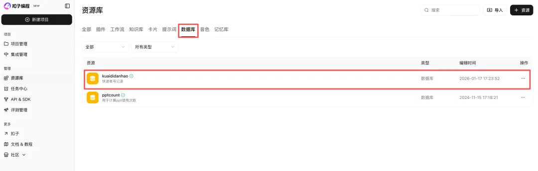 接下来可以在Coze扣子中去实现这两个功能,在Coze中,数据库功能是比较强大的是足以支撑我们完成这套流程的核心数据存储。