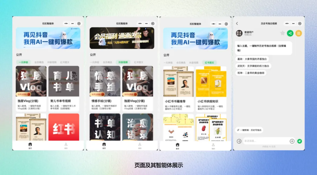 - 项目核心:通过智能体 + 自动剪辑功能,一键生成抖音爆款视频、小红书图文,覆盖历史号独白、Vlog、书单推荐等多个场景。