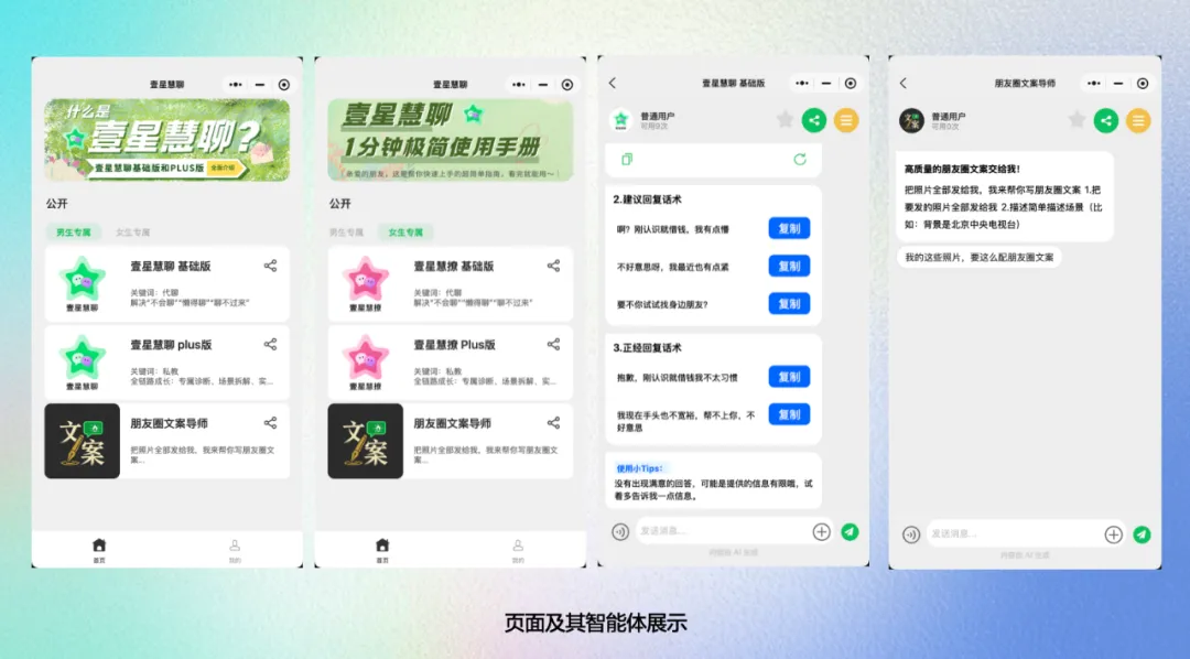 - 小微赋能:支持智能体公开与分类功能,创新按性别分区展示,让用户能快速找到所需智能体,同时通过 “基础版 + PLUS 版” 分层服务,满足不同用户的社交提升需求,使用体验更便捷贴心。