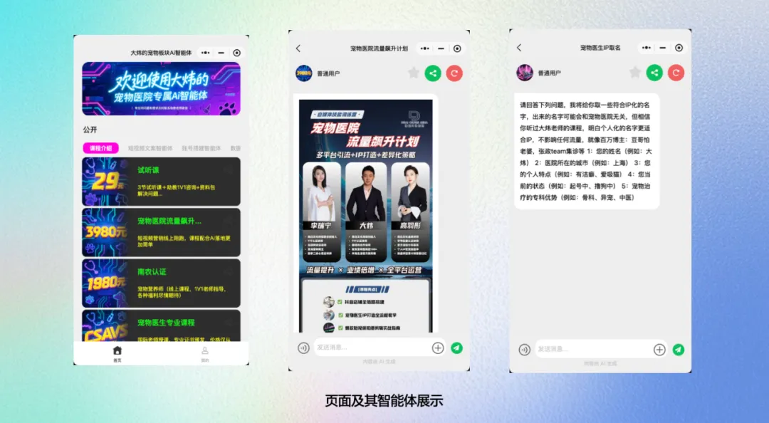 - 项目核心:聚焦宠物医疗领域,为宠物医院从业者和行业学习者提供 IP 取名、短视频文案创作、账号搭建、专业课程学习等多维度服务。