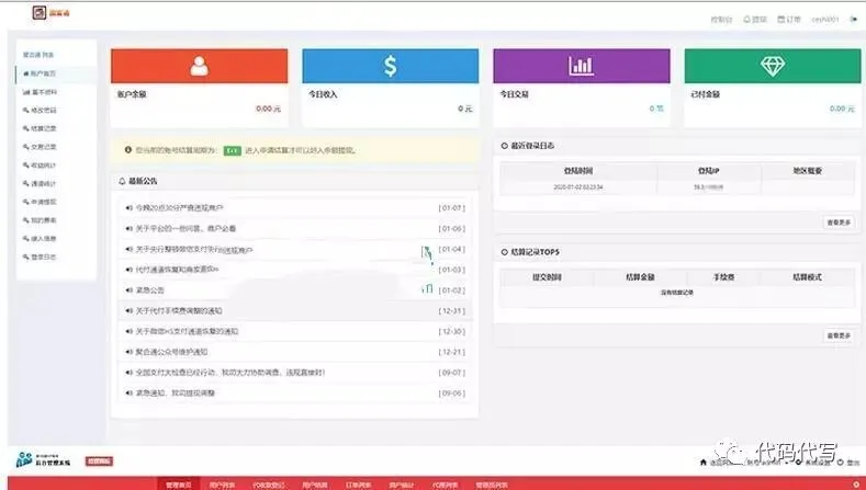 PHP聚合通支付系统源码全开源+国富通+代付模式+代理商模式,内附安装教程1.系统具有聚合支付、扫码支付,自动运维等特点。只要推广出去,无需过多人工干预。2.后台可设置提现方式,提现手续费、支付费率等功能。3.完整强大的数据统计功能让你实时查看自己的每一笔收益。5.可查看通道列表,通用网关以及网银列表,可冻结异常订单