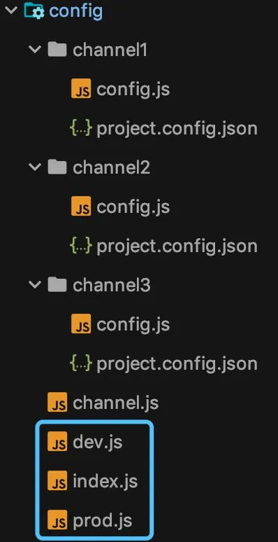 config 目录为 Taro 初始化后的默认配置目录,图中蓝色框框内的三个文件(dev、index、prod)为默认生成的配置文件,剩下的文件,则为分身所需的配置。图中配置了三个分身,我们以 channel1 为例,config 是该分身的一些配置,project.config.json 就是该分身小程序的基本配置,如: