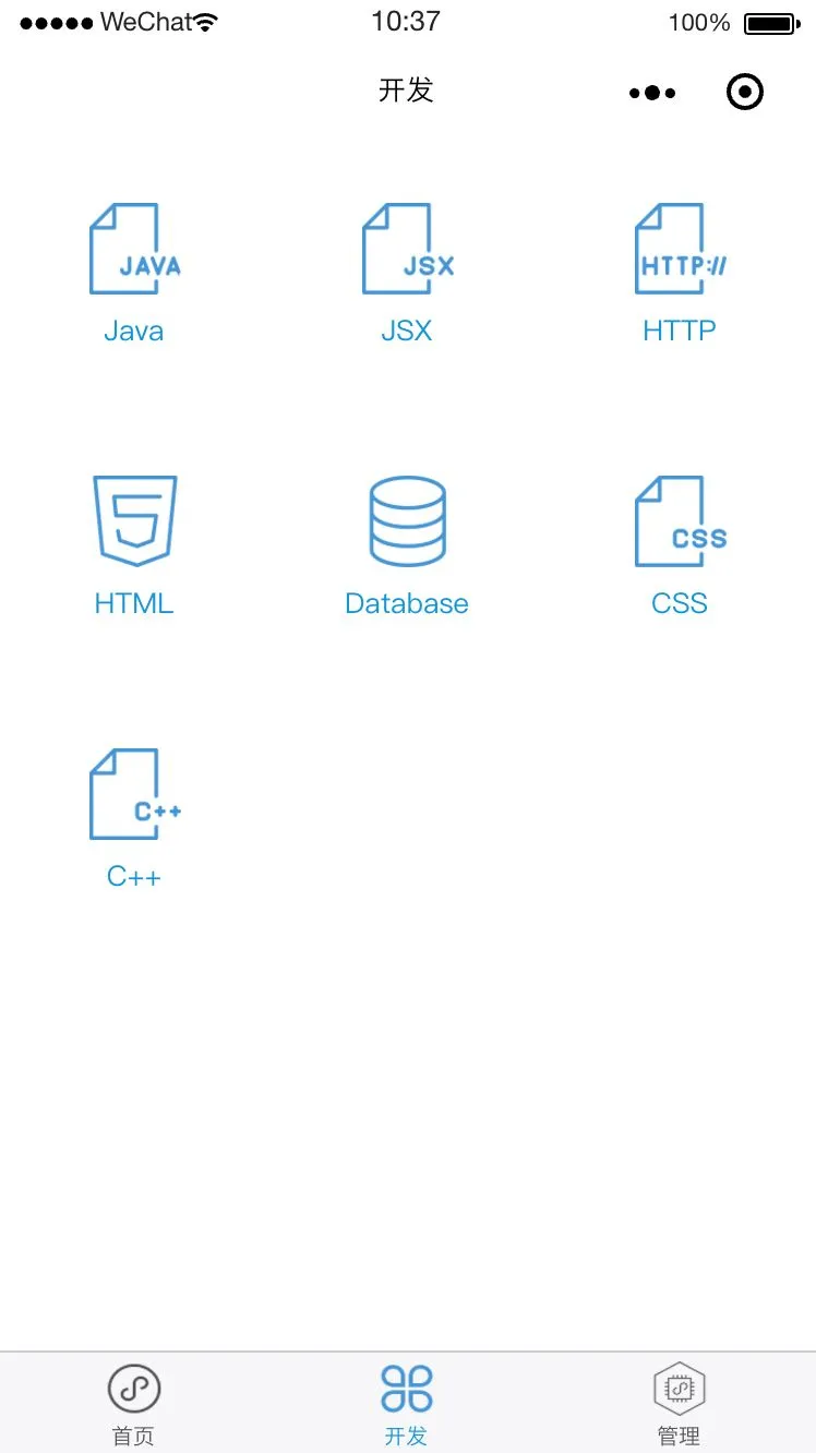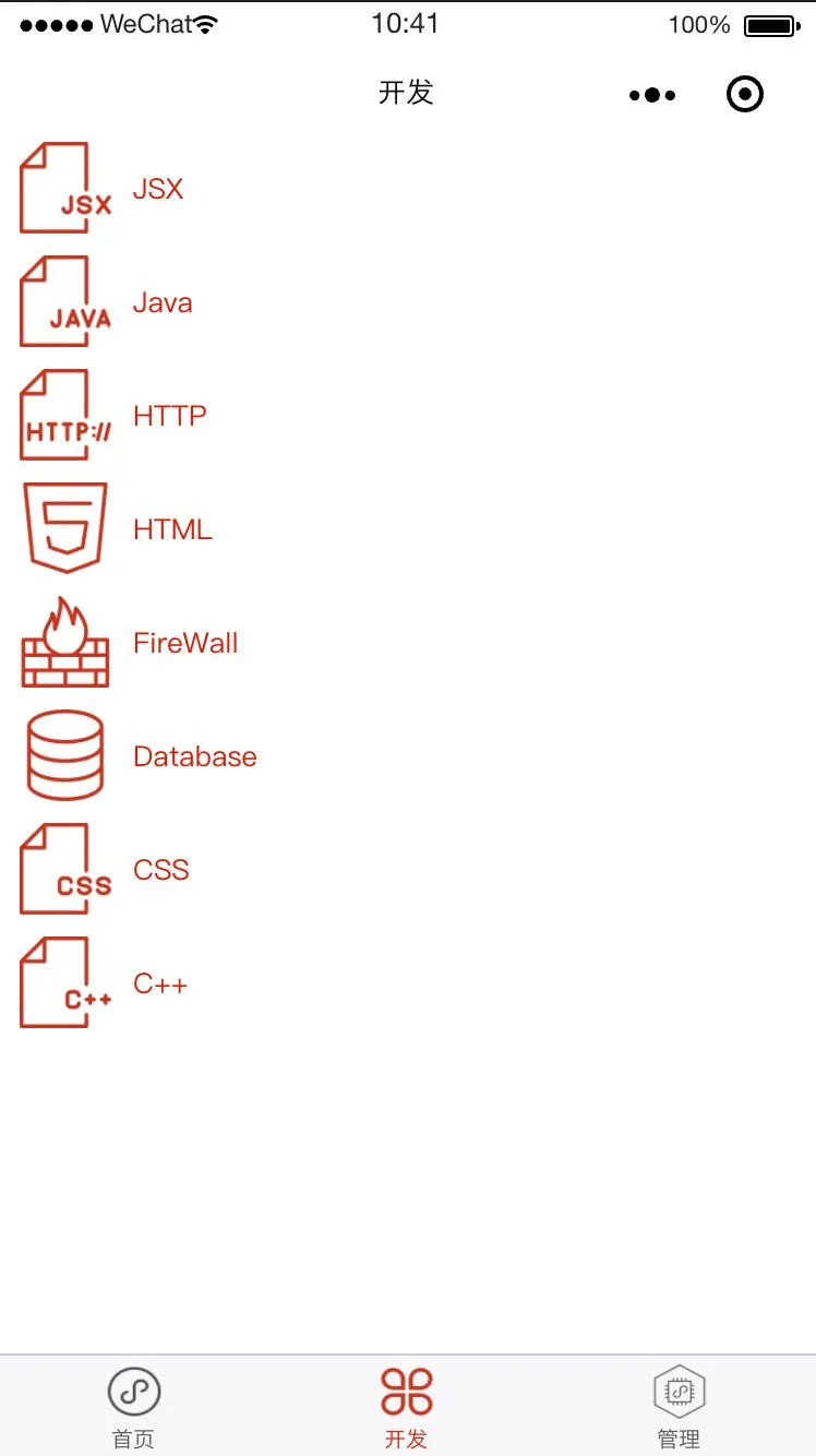 “小程序 A”并没有 FireWall 这一项,而且,这两个小程序的前两个条目 Java 和 JSX 的顺序是不一样的。不仅如此,如果运行小程序,点击各项的话你会发现,点击 C++ 这一项,“小程序 B”是跳转到条目详情页面,而“小程序 A”则是跳转到“管理”Tab 页。