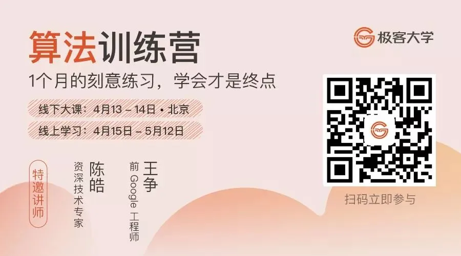 很多人在算法学习方面付出了不少时间和精力,但效果甚微。为此,我们邀请资深技术专家陈皓(左耳朵耗子)和前 Google 工程师王争一起开设了一期“算法训练营”。希望通过本次训练营,能帮你快速摸清算法学习规律,掌握关键知识脉络及核心原理。点击“阅读原文”或扫描图中二维码了解详情,名额有限,报名从速。
