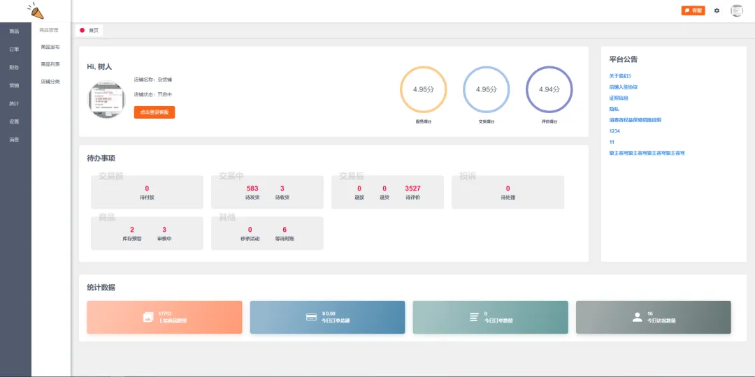 物流配送、自提点、店铺信息、PC/移动端装修、店员与权限管理
