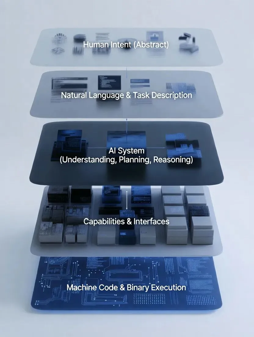 在这种结构下,系统不再主要为人类设计,而是为 AI 设计;人类从“第一操作者”退到“最终仲裁者”。我们的意图,将会成为第一的生产力。