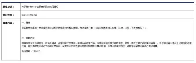 近日,根据百度禁止推广类行业标准及窃取网名信息物料整改通知,为保证客户推广内容符合国家相关政策,法律,法规,下发策略如下: