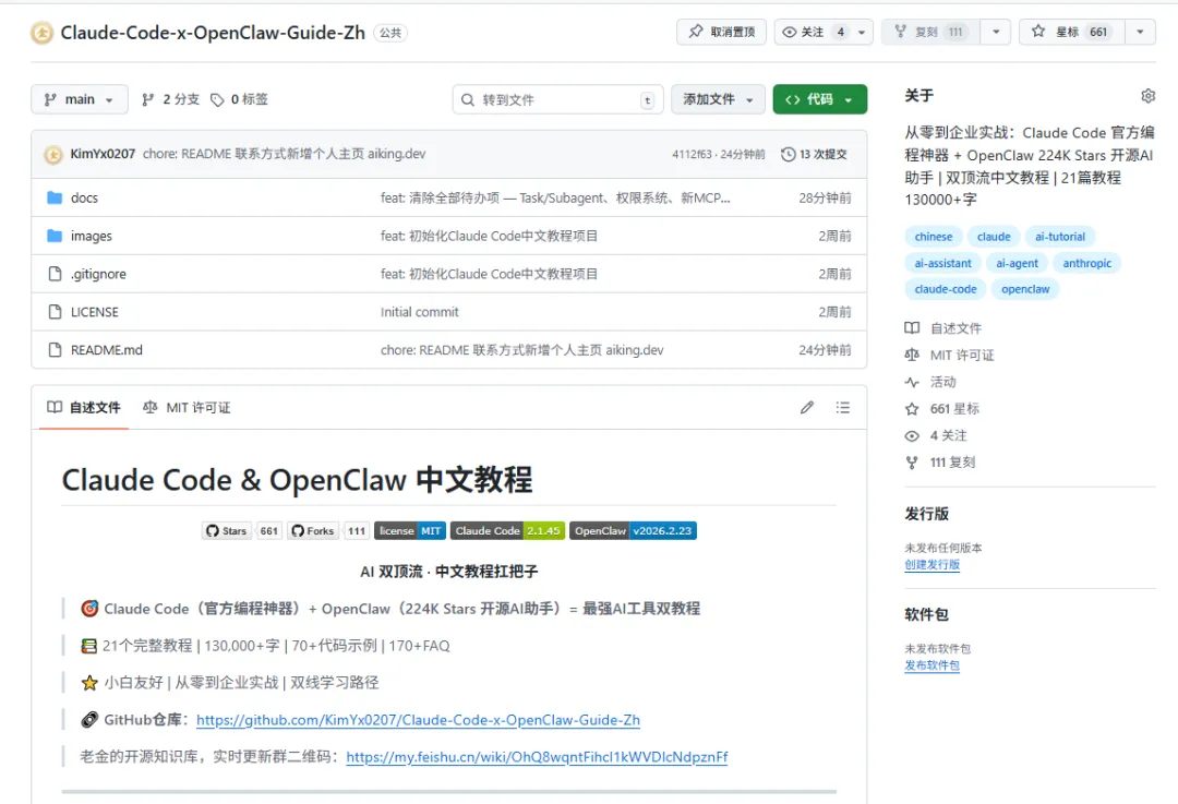 10万字教程全面升级,Claude Code版本更新到最新,新增OpenClaw完整中文教程。