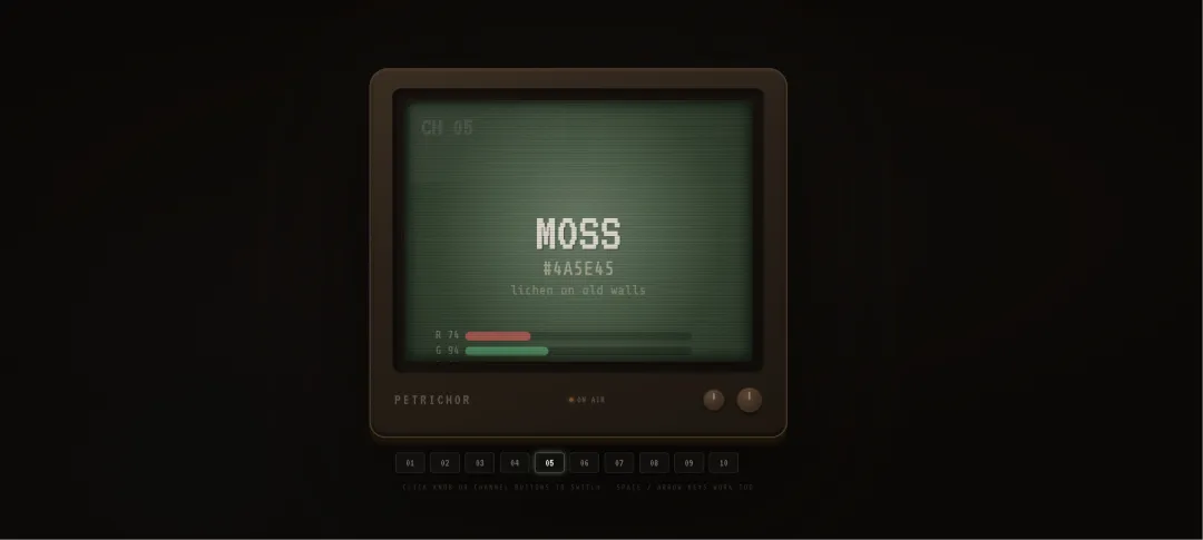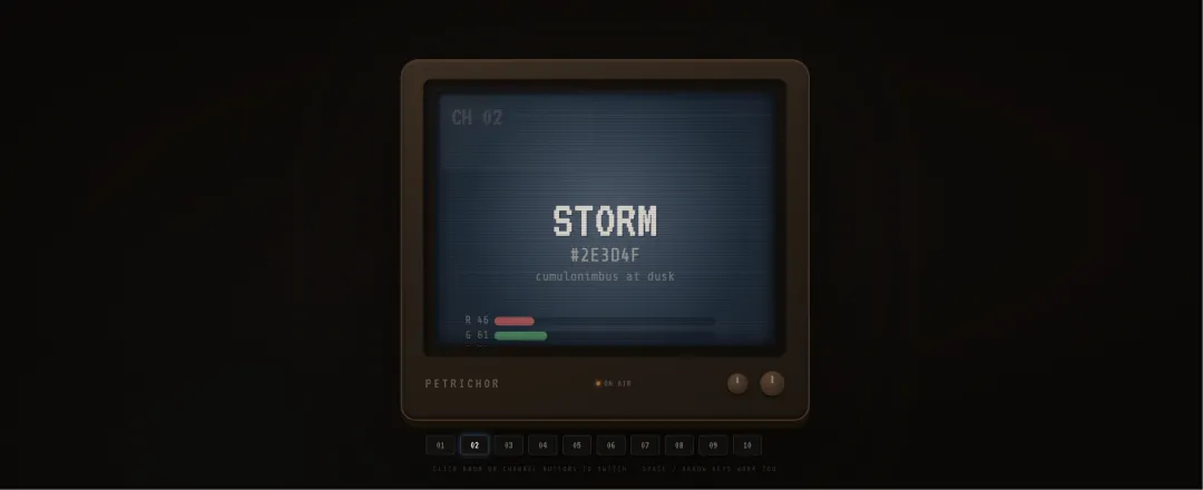 // ── PALETTE / CHANNELS ───────────────────────────────────────────const CHANNELS = [ { ch: 1, name: 'Ink', hex: '#1a1814', r:26, g:24, b:20, desc:'the sky at midnight' }, { ch: 2, name: 'Storm', hex: '#2e3d4f', r:46, g:61, b:79, desc:'cumulonimbus at dusk' }, { ch: 3, name: 'Slate', hex: '#6b7f8e', r:107, g:127, b:142, desc:'wet flagstone' }, { ch: 4, name: 'Rain', hex: '#8fafc2', r:143, g:175, b:194, desc:'first drops on glass' }, { ch: 5, name: 'Moss', hex: '#4a5e45', r:74, g:94, b:69, desc:'lichen on old walls' }, { ch: 6, name: 'Clay', hex: '#9c7c5e', r:156, g:124, b:94, desc:'exposed earth' }, { ch: 7, name: 'Ochre', hex: '#c4893a', r:196, g:137, b:58, desc:'amber before the storm' }, { ch: 8, name: 'Petal', hex: '#d4a5a0', r:212, g:165, b:160, desc:'wild rose, last bloom' }, { ch: 9, name: 'Dust', hex: '#c8bfad', r:200, g:191, b:173, desc:'dry road before rain' }, { ch: 10, name: 'Stone', hex: '#e8e2d9', r:232, g:226, b:217, desc:'limestone in afternoon light' },];// ── CANVAS SETUP ─────────────────────────────────────────────────const tvScreen = document.getElementById('tvScreen');const canvas = document.getElementById('screen');const ctx = canvas.getContext('2d');const glow = document.getElementById('glow');let CW, CH;function resizeCanvas() { const rect = tvScreen.getBoundingClientRect(); CW = canvas.width = rect.width; CH = canvas.height = rect.height;}resizeCanvas();window.addEventListener('resize', resizeCanvas);// ── STATE ─────────────────────────────────────────────────────────let currentCh = 0;let staticNoise = null;let noiseAge = 0;let staticBurst = 0;let switching = false;let scanOffset = 0;let glitchTimer = 0;let ticker = 0;// ── BUILD CHANNEL BUTTONS ─────────────────────────────────────────const strip = document.getElementById('channelStrip');CHANNELS.forEach((ch, i) => { const btn = document.createElement('button'); btn.className = 'ch-btn' + (i === 0 ? ' active' : ''); btn.textContent = String(ch.ch).padStart(2, '0'); btn.style.setProperty('--ch-color', ch.hex); btn.addEventListener('click', () => switchTo(i)); strip.appendChild(btn);});function updateButtons(idx) { document.querySelectorAll('.ch-btn').forEach((b, i) => { b.classList.toggle('active', i === idx); });}// ── PHOSPHOR GLOW ─────────────────────────────────────────────────function setGlow(ch) { const { r, g, b } = ch; const brightness = (r * 0.299 + g * 0.587 + b * 0.114) / 255; const a = 0.25 + brightness * 0.3; glow.style.boxShadow = ` 0 0 18px rgba(${r},${g},${b},${a}), 0 0 45px rgba(${r},${g},${b},${a * 0.6}), 0 0 90px rgba(${r},${g},${b},${a * 0.3}) `;}// ── NOISE BUFFER ──────────────────────────────────────────────────function makeNoiseBuffer() { const off = document.createElement('canvas'); off.width = CW; off.height = CH; const oc = off.getContext('2d'); const id = oc.createImageData(CW, CH); const d = id.data; for (let i = 0; i < d.length; i += 4) { const v = Math.random() * 255 | 0; d[i] = d[i+1] = d[i+2] = v; d[i+3] = 255; } oc.putImageData(id, 0, 0); return off;}// ── DRAW SCREEN ───────────────────────────────────────────────────function drawScreen(ch, staticAlpha) { const { r, g, b, hex, name, desc, ch: chNum } = ch; ticker++; // Base color fill ctx.fillStyle = hex; ctx.fillRect(0, 0, CW, CH); // CRT vignette darkening const vg = ctx.createRadialGradient(CW/2, CH/2, CH*0.1, CW/2, CH/2, CH*0.72); vg.addColorStop(0, 'rgba(0,0,0,0)'); vg.addColorStop(1, 'rgba(0,0,0,0.38)'); ctx.fillStyle = vg; ctx.fillRect(0, 0, CW, CH); // Phosphor warmth glow from center const luma = (r*0.299 + g*0.587 + b*0.114) / 255; const pgA = 0.12 + luma * 0.15; const pg = ctx.createRadialGradient(CW/2, CH/2, 0, CW/2, CH/2, CH*0.55); pg.addColorStop(0, `rgba(255,255,255,${pgA})`); pg.addColorStop(1, 'rgba(255,255,255,0)'); ctx.fillStyle = pg; ctx.fillRect(0, 0, CW, CH); // Moving scanline band scanOffset = (scanOffset + 0.4) % CH; ctx.fillStyle = 'rgba(255,255,255,0.025)'; for (let y = scanOffset % 80; y < CH; y += 80) { ctx.fillRect(0, y, CW, 2); } // Occasional glitch line glitchTimer++; if (glitchTimer > 180 && Math.random() < 0.03) { glitchTimer = 0; const gy = Math.random() * CH | 0; ctx.fillStyle = `rgba(255,255,255,${Math.random() * 0.4})`; ctx.fillRect(0, gy, CW, (Math.random() * 3 + 1) | 0); } // Text color based on background luminance const textLight = `rgba(232,226,217,0.92)`; const textDark = `rgba(26,24,20,0.80)`; const subLight = `rgba(200,191,173,0.65)`; const subDark = `rgba(46,24,20,0.55)`; const dimLight = `rgba(200,191,173,0.40)`; const dimDark = `rgba(46,24,20,0.38)`; const mainColor = luma < 0.45 ? textLight : textDark; const subColor = luma < 0.45 ? subLight : subDark; const dimColor = luma < 0.45 ? dimLight : dimDark; // Channel number — top left ctx.font = `bold ${CW * 0.075}px 'VT323', monospace`; ctx.textAlign = 'left'; ctx.fillStyle = `rgba(0,0,0,0.2)`; ctx.fillText(`CH ${String(chNum).padStart(2, '0')}`, CW*0.05 + 1, CW*0.1 + 1); ctx.fillStyle = mainColor.replace('0.92','0.15').replace('0.80','0.12'); ctx.fillText(`CH ${String(chNum).padStart(2, '0')}`, CW*0.05, CW*0.1); // Color name — large centered const nameSize = CW * 0.155; ctx.font = `${nameSize}px 'VT323', monospace`; ctx.textAlign = 'center'; // drop shadow ctx.fillStyle = 'rgba(0,0,0,0.22)'; ctx.fillText(name.toUpperCase(), CW/