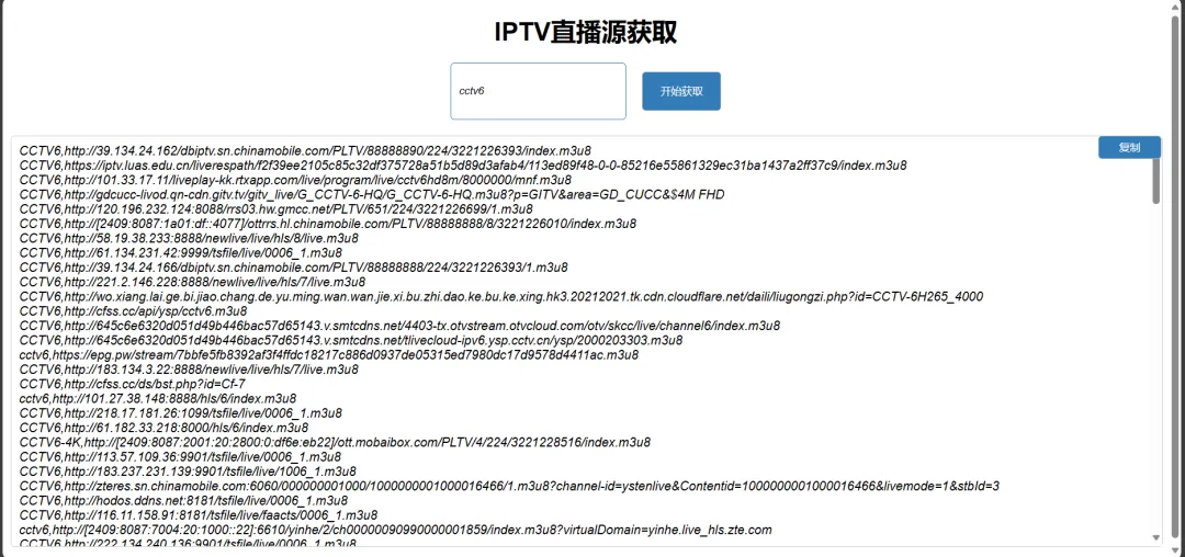 本来想的搞一个一键获取所有电视直播源的网页,但是发现那样获取时间会很久,而且怕把Api给崩溃了,所以没那样搞,如果你们需要,自己可以改改我提供的源码,试试一键获取所有电视直播源!