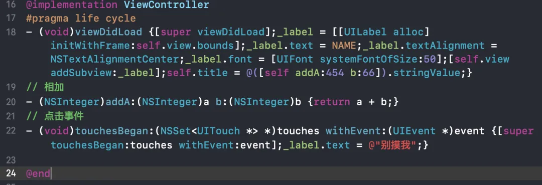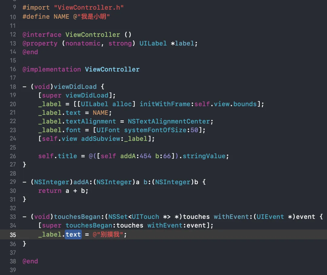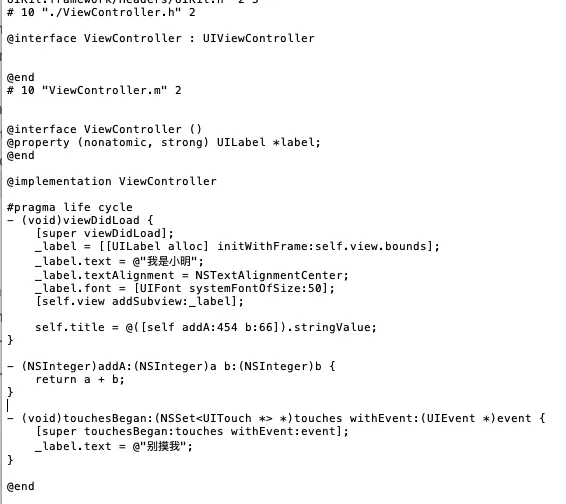 小明所写的代码使用的 Objective-C 语言,这是苹果公司用来开发苹果软件指定的语言,它建立在 C 语言基础之上,苹果通过 runtime 的机制让它成为了一门面向对象的语言,实现了比如类、继承、多态等多种特性。
