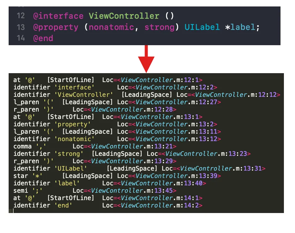 clang -isysroot /Applications/Xcode.app/Contents/Developer/Platforms/iPhoneSimulator.platform/Developer/SDKs/iPhoneSimulator.sdk -E -Xclang -dump-tokens ViewController.m看下图,通过 Loc 记录 token 所在文件的位置 :