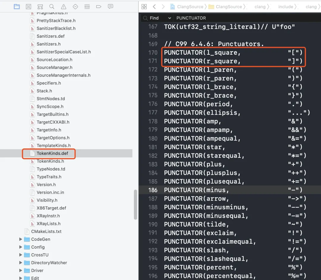 这些 token 的定义可以在 clang 源码中的 TokenKinds.def 文件中找到。