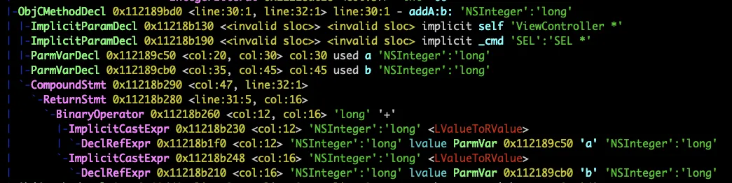 clang -isysroot /Applications/Xcode.app/Contents/Developer/Platforms/iPhoneSimulator.platform/Developer/SDKs/iPhoneSimulator.sdk -Xclang -ast-dump -fsyntax-only ViewController.m函数对应下面的语法树: