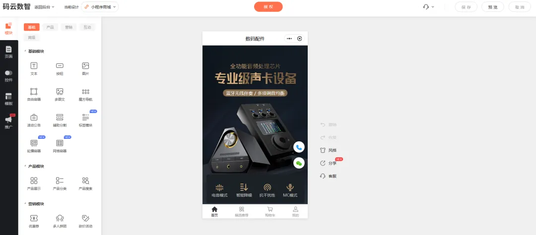 进入管理后台的装修模块,平台提供2000多个涵盖各行业的现成模板。按行业、风格筛选后预览,选择贴合自身业务的模板一键套用,无需从零设计。进入可视化编辑页面后,采用拖拽式操作:左侧为组件库,包含轮播图、商品列表、导航、表单、营销组件等;中间为预览区;右侧为属性设置面板。可自由添加、删除、调整模块位置,替换店铺logo、轮播海报、商品图片与文案,设置主题色、字体、布局样式。全程"所见即所得",无需设计基础即可打造贴合品牌风格的界面。